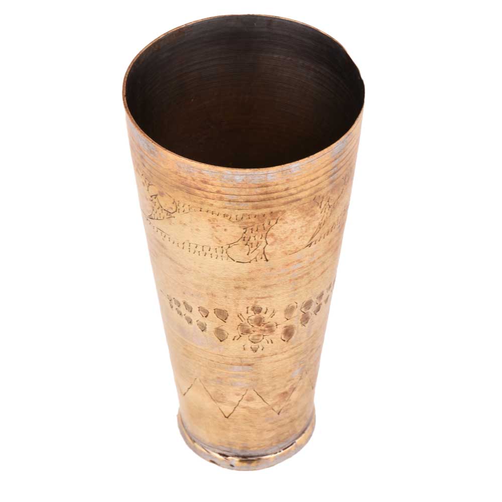 Three Band Carved Design Brass Lassi Glass is a trademark of north regions of Punjab and Rajasthan make wonderful vases or beakers to store paint brushes or kitchen utensils they are sturdy heavy and unique and is great for home décor and personal gifting. Great for Vintage Lovers Truly Collectors Piece.