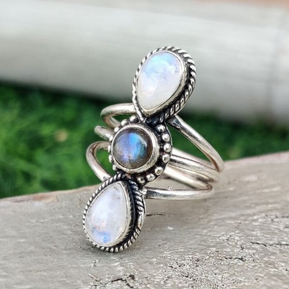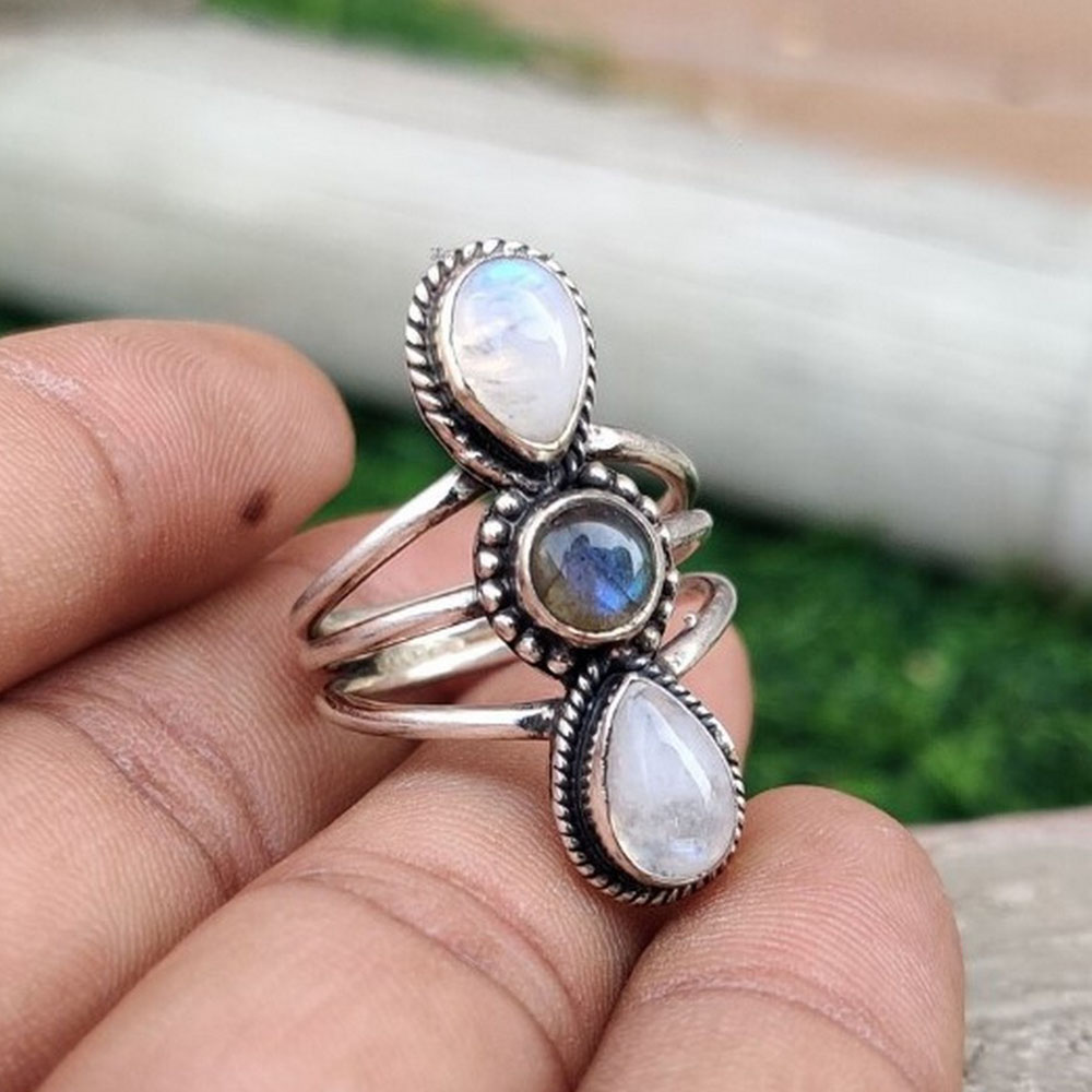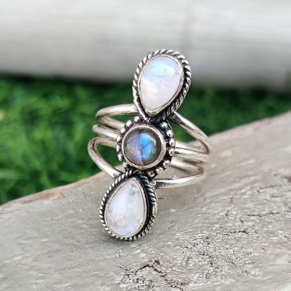 Elevate your style with the allure of our three stone 925 sterling silver ring handmade boho jewelry, where natural moonstone & labradorite (three stones), 925 sterling silver and boho come together to create a bold sophistication. This ring is for vintage admirers, each piece reflecting individuality and care. Packed & quality-checked by Indianshelf.