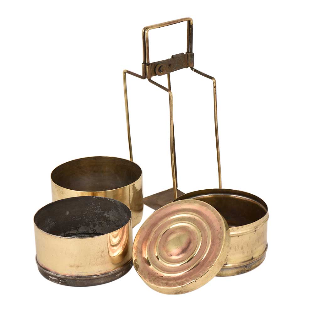The brass three compartments Tiffin box is made of very high quality brass it comes with three storage boxes that are stacked one above the other opened by unlocking a simple catch on the either handle and then removing it . Now used as a table ornament, jewelry storage and for presentation of food.