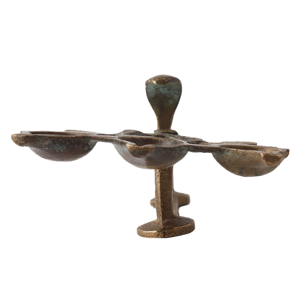 A three wick arti lamp with a handle was employed in this vintage's house, mandir, and office décor. It can also be used to bestow supernatural blessings on a loved one as a good luck present. The vintage used little arti lamp with handle was made by master Indian artisans and represents goodness and purity. Bring this lovely diya home to enliven your space and add a touch of class.