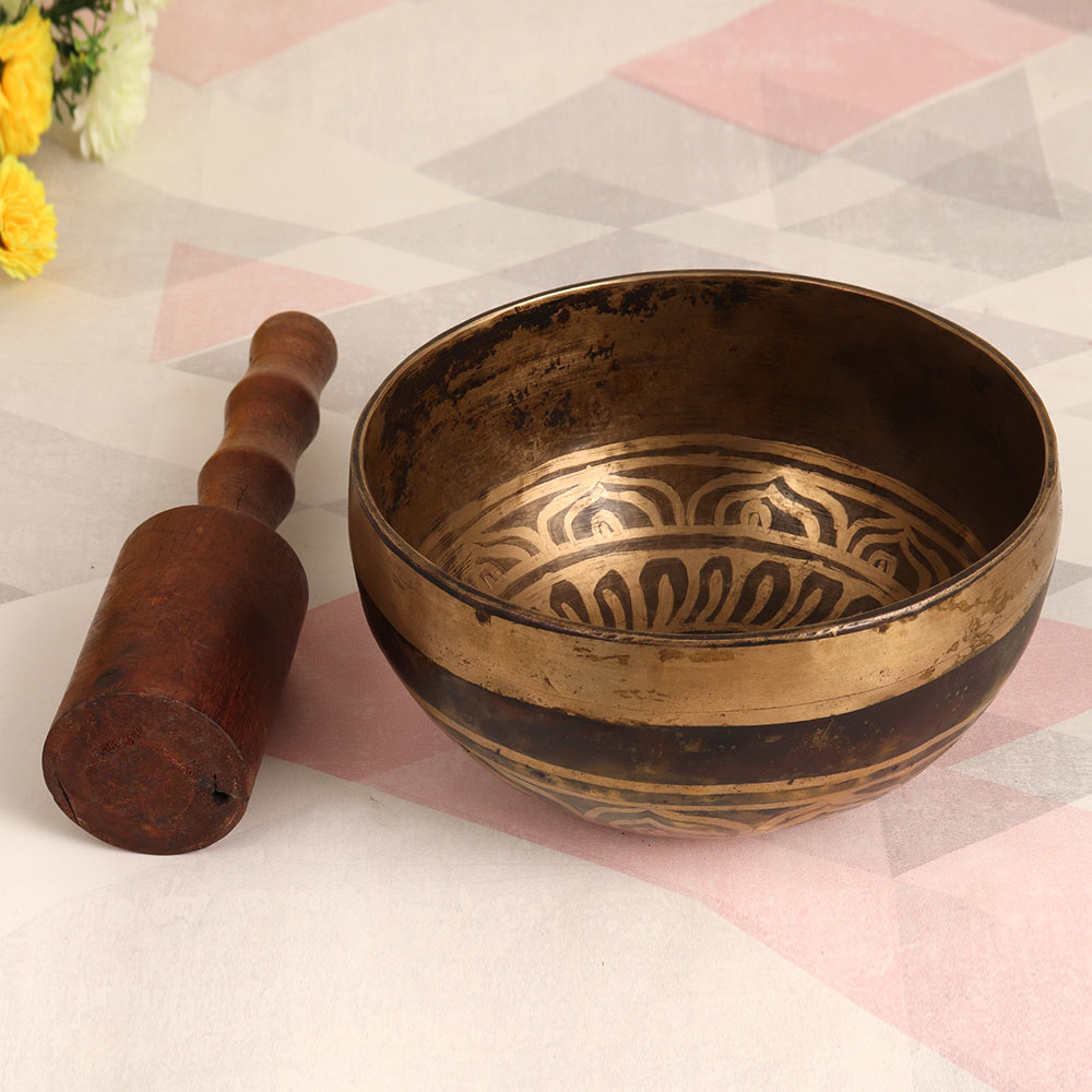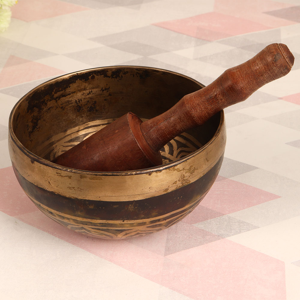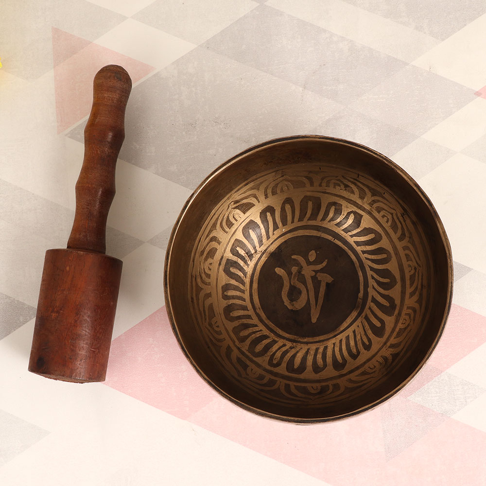 Adorn your interior with the timeless allure of our Vintage Bell Metal Om Singing Bowl that is handcrafted by skilled Tibetan artisans. This extraordinary piece showcases an antique brown finish that exudes rustic charm and is sure to captivate onlookers. Crafted from high-quality bell metal, this singing bowl is more than just an aesthetic addition; it's a versatile and meaningful instrument. The soothing sound produced by striking the bowl with the included wooden mallet can promote relaxation, meditation, and mindfulness. The resonating "Om" symbol holds spiritual significance, making this bowl a wonderful addition to your spiritual practice or yoga sessions. This versatile piece is a perfect fit for any environment, be it your home, office, restaurant, hotel, or shop, adding an element of tranquillity and visual appeal. Furthermore, it's a delightful addition to any vintage collection, adding a touch of heritage and craftsmanship. Make a memorable gesture by gifting this unique singing bowl to your family, friends or relatives on special, festive, or auspicious occasions.