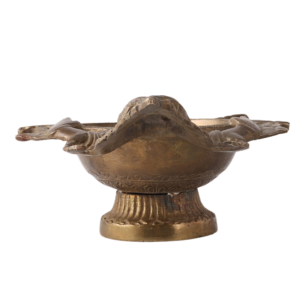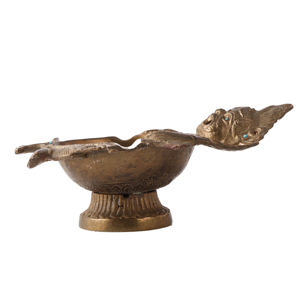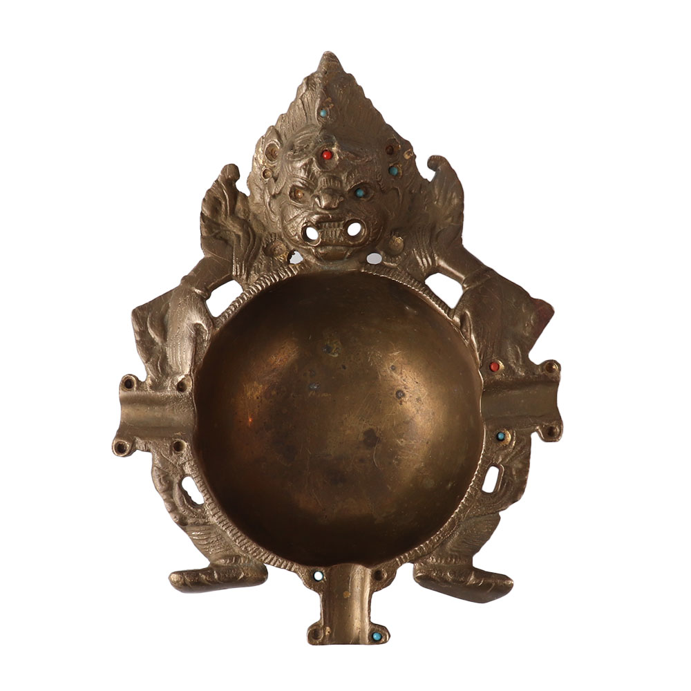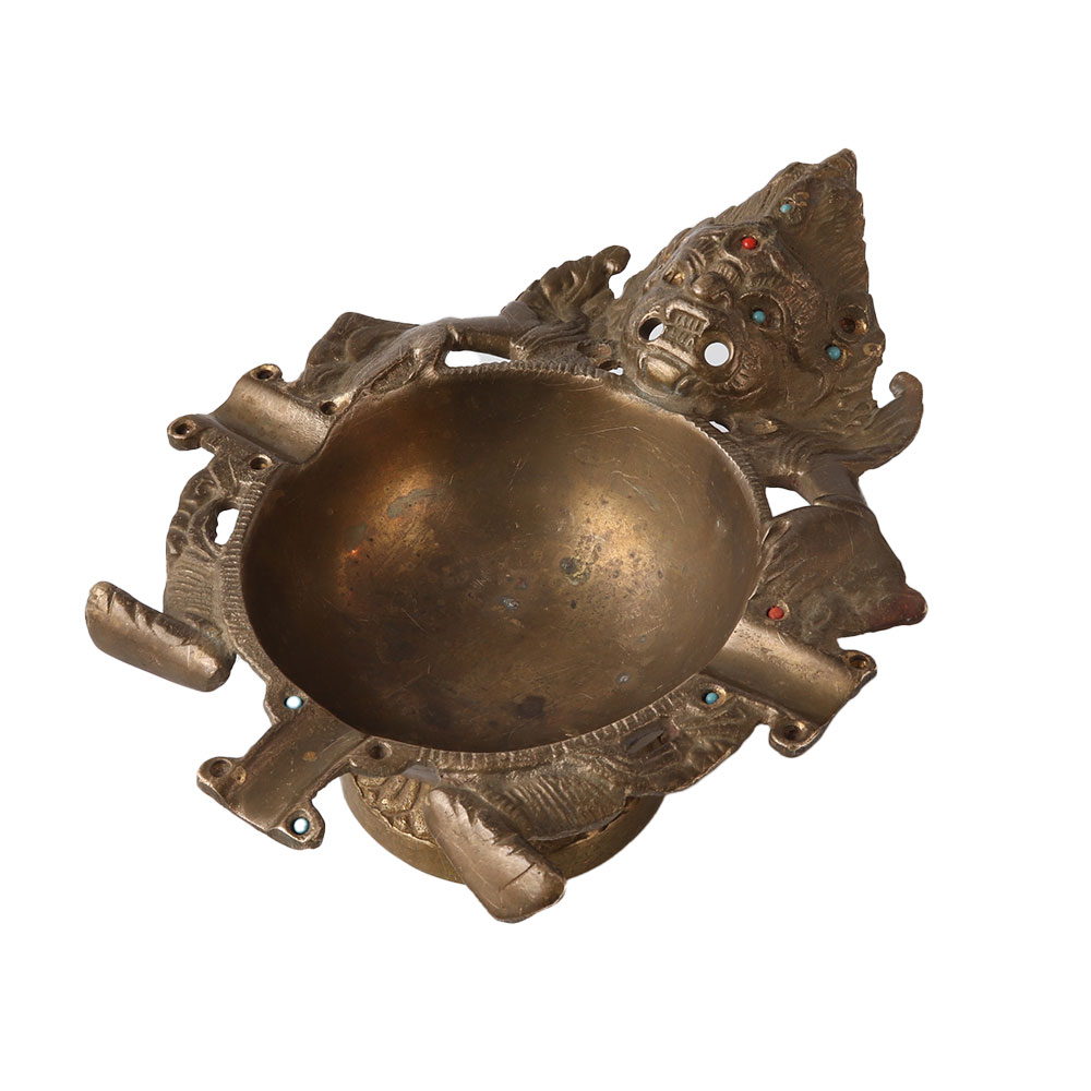 Handcrafted intricately carved brass ashtray in the shape of Mahakala , a Buddhist deity with decorative edges embedded with tiny stones. The face on this brass ashtray resembles Mahakala, the Tibetan protector god, rather than a demon. The Tibetan god Mahakala has four arms. In Himalayan Vajrayana Buddhism, there are several terrifying-looking protective Gods. The feel is heavy and solid. An elegant present for family and friends. It has three cavities to hold cigarettes .