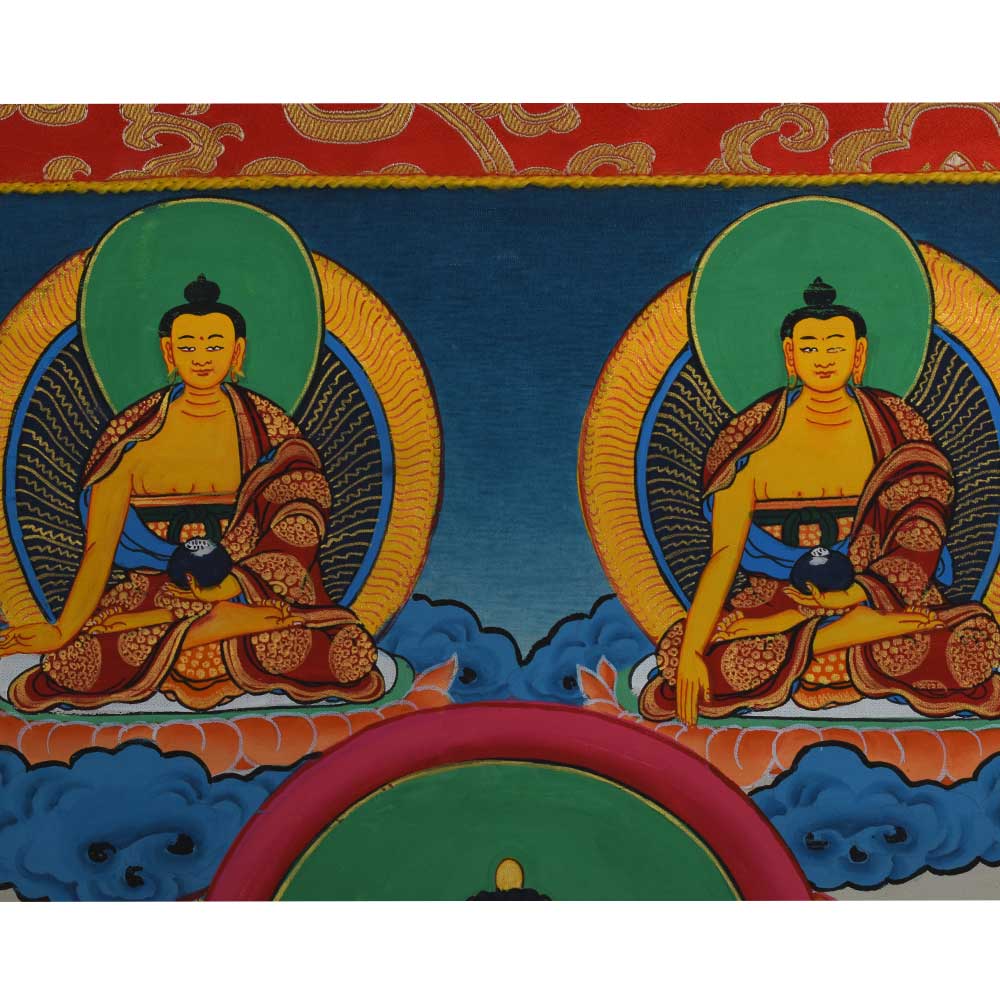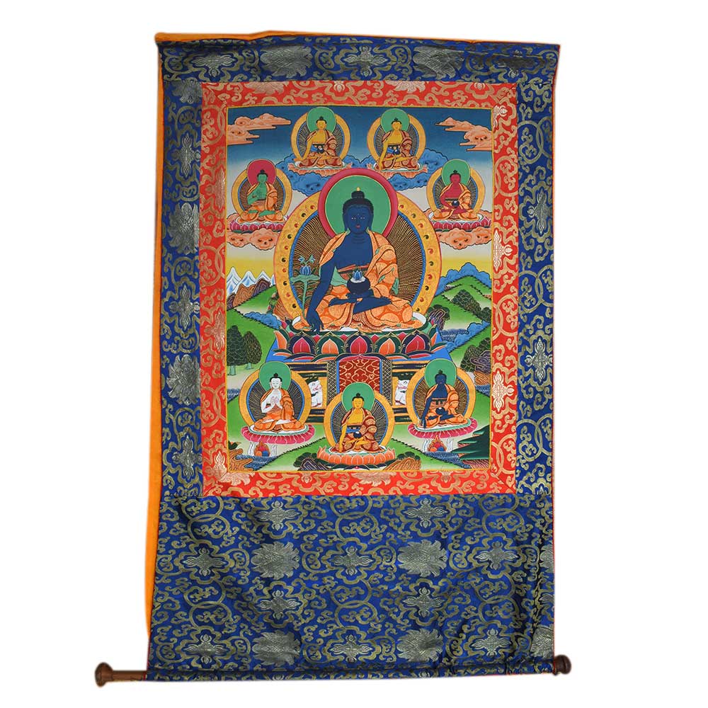 The thangka features an intricate depiction of the Eight Medicine Buddha. The Medicine Buddha is a compassionate and healing god. He is said to help people who are suffering from mental or physical illnesses. His picture is frequently depicted with beams of lapis lazuli light emanating from his crown. The ultimate source of healing is represented by the Eight Medicine Buddha Design.