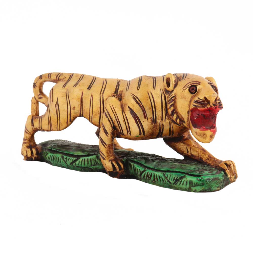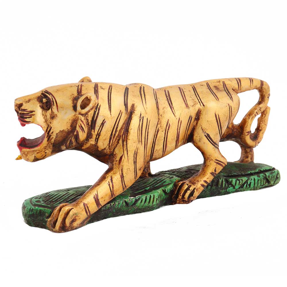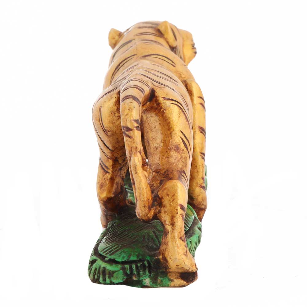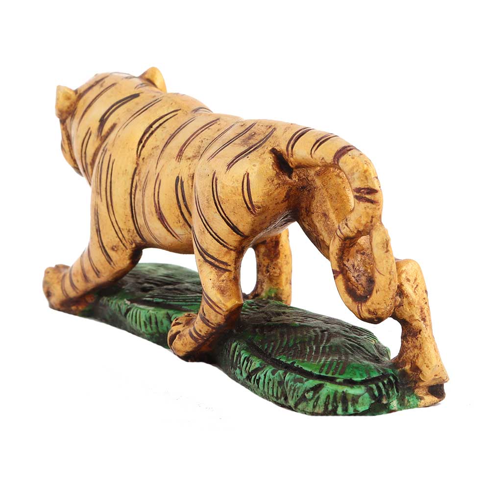 This perfectly sized yet excellently carved Tiger hand-painted on a green-painted base is a powerful symbol. It is also a great addition to your business spaces. The product is designed to display the animal scavenging for food. The size is medium enough to accommodate your nightstand but large enough to leave a strong impression. It is made using a white stone powder that lends a great appeal when used as a bookend.