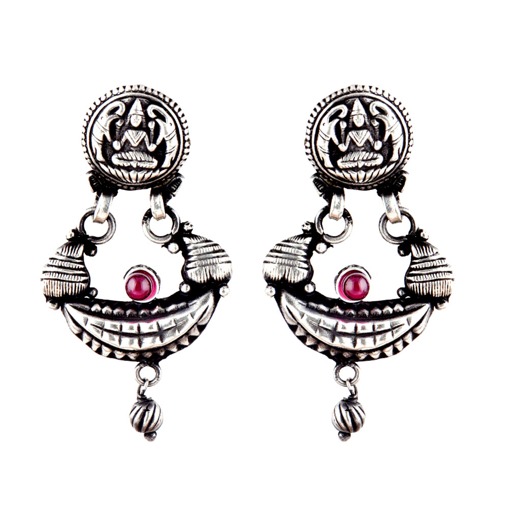92.5 Sterling Silver Earrings Goddess laxmi with elephants engraved stud with Crescent moon and attached motifs danglers . Team it up with your traditional sari or suit or jeans with kurtis for anniversary, valentine date or other social or office function.