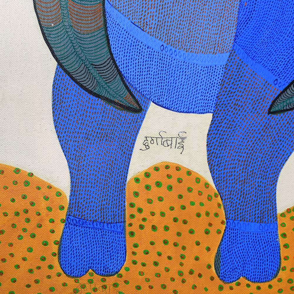 - Intricate patterns: The fine details, including dot work and geometric shapes, demonstrate Durgabai’s mastery of the traditional Gond style.
