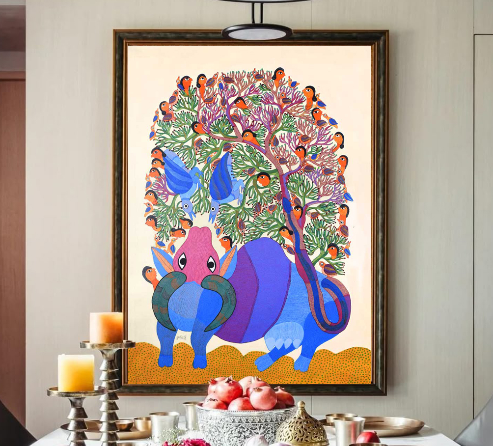 Durgabai Vyam, a renowned Gond artist, was honored with the Padma Shri in 2022 for her exceptional contributions to the traditional art form of Gond painting without frame. Hailing from the Gond tribe in Madhya Pradesh, her works are an intricate blend of symbolism, cultural heritage, and vibrant colors. Through her paintings, she brings to life the stories and myths of her community, preserving the rich folklore of the Gond people for future generations. This acrylic painting on paper by Durgabai Vyam showcases her signature style, which is deeply rooted in nature and spirituality. The painting features a harmonious blend of animal motifs, and geometric patterns. Durgabai’s use of vivid colors, intricate dotting, and dynamic forms conveys a sense of movement and energy. The composition feels alive, with animals and elements of the natural world appearing to leap off the paper. Each symbol in the artwork represents an aspect of Gond mythology, evoking a deep connection to the environment and the spirit world.