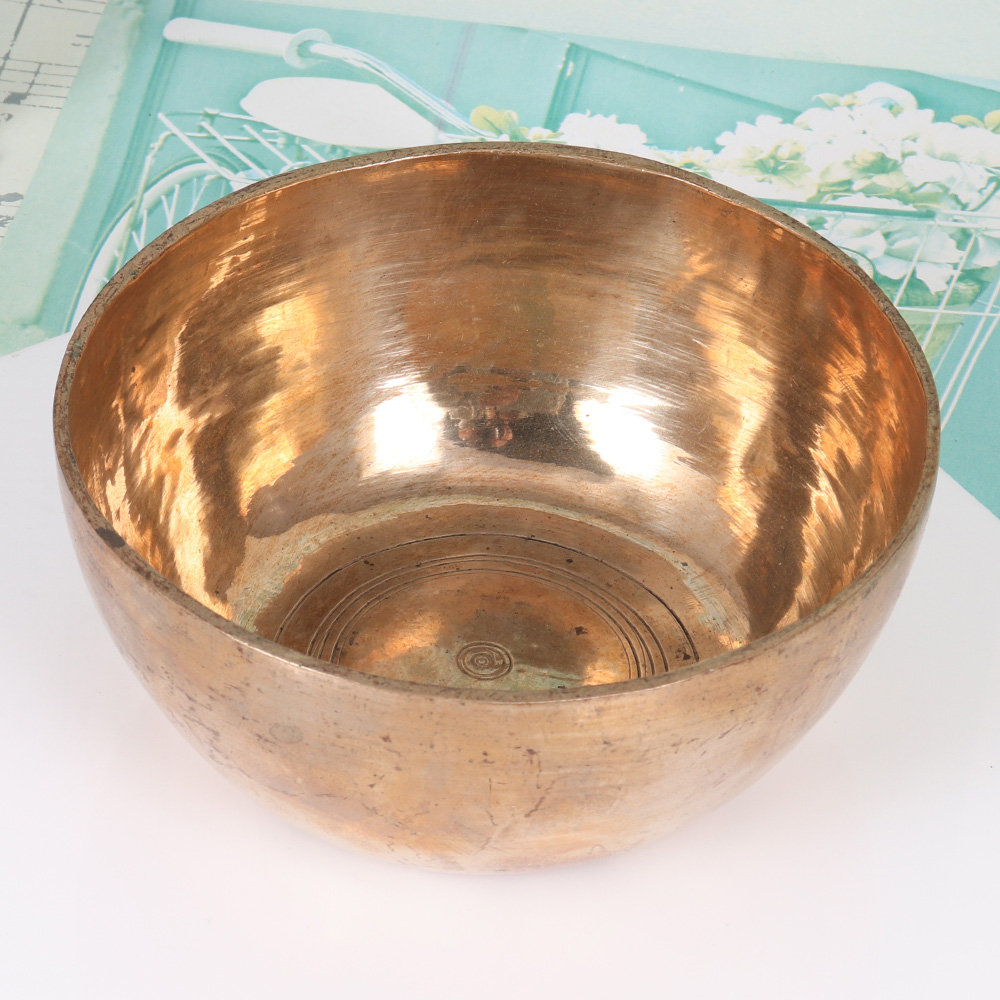 Immerse yourself in the timeless wisdom of the Himalayas with this captivating bell metal singing bowl, a testament to the enduring artistry of Nepal. Meticulously handcrafted by skilled artisans using traditional techniques passed down for generations, this instrument emanates a deep, soothing tone that can transport you to a state of profound relaxation and inner peace. Whether you're seeking to deepen your meditation practice, create a calming ambiance in your home, or simply indulge in the healing power of sound, this Nepalese singing bowl is a must-have addition to your wellness toolkit. The plain brown finish gives it a rustic, earthy aesthetic that complements any decor, while the durable bell metal construction ensures it will be a cherished part of your self-care routine for years to come. Unlock the ancient wisdom of Nepal and elevate your mindfulness practice with this captivating bell metal singing bowl – a timeless piece that will become a treasured companion on your journey of personal growth and spiritual exploration.