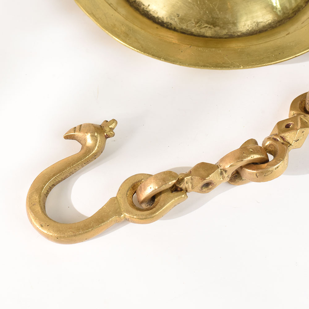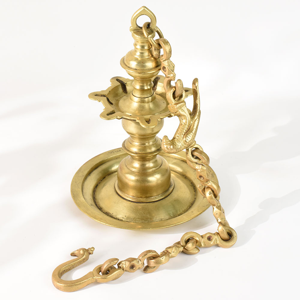 Bring home the timeless charm of South Indian craftsmanship with this vintage brass hanging oil lamp, beautifully designed with an ornate chain and traditional detailing. Hand-cast by skilled artisans, this lamp reflects the ancient art of lamp-making practiced in South Indian temples and heritage homes. Its warm golden tone and sculpted silhouette create a spiritual ambiance, making it perfect for puja rooms, meditation corners, home decor, and festive rituals. The accompanying brass chain allows the lamp to be hung gracefully, while the deep oil reservoir provides a steady flame for long hours. Every curve, ridge, and motif celebrates cultural symbolism, making this piece a cherished collectible for decor lovers and connoisseurs of Indian heritage. Ideal for gifting on festivals, housewarmings, weddings, and spiritual celebrations, this lamp blends tradition with decorative elegance. Whether displayed as a centerpiece or used during rituals, it instantly elevates any space with its sacred glow.