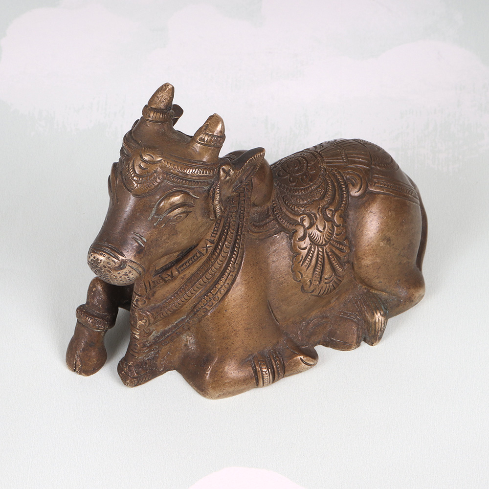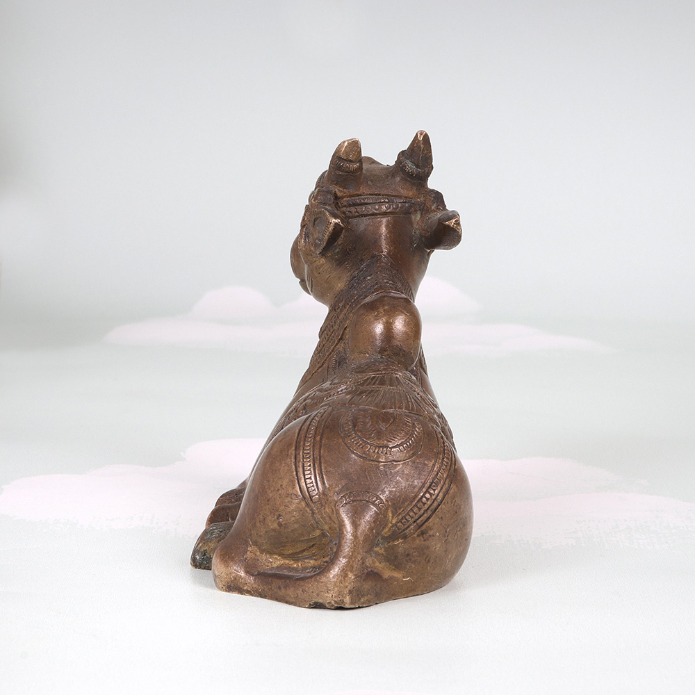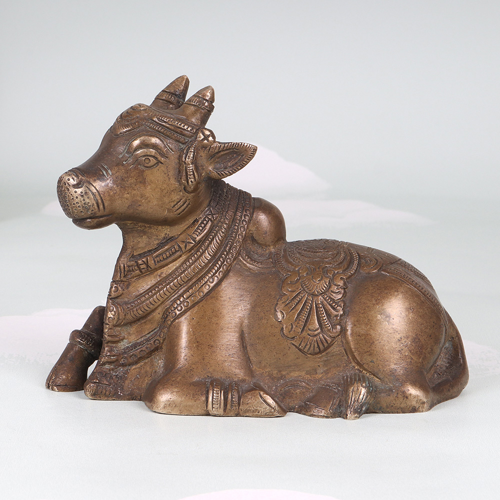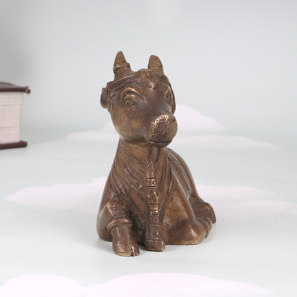 Elevate your meditation practice and infuse your living space with the captivating presence of this exquisite vintage brass Nandi statue. Meticulously crafted from solid brass, this stunning piece radiates an aura of timeless elegance and spiritual significance, drawing the eye inward with its intricate carvings and captivating visual details. The Nandi's seated posture is specifically designed to facilitate focused meditation and inner reflection. As you settle into your practice, the Nandi's grounded presence will help center your focus, allowing you to delve deeper into the realms of mindfulness and self-discovery. Whether you're an experienced yogi or simply seeking to cultivate more stillness and calm in your daily life, this vintage brass Nandi will become a cherished companion on your journey of spiritual growth. Versatile and visually stunning, this Nandi statue seamlessly complements a wide range of decor styles, from modern minimalist to traditional. Its timeless aesthetic will lend an air of sophistication and cultural richness to your living space, serving as a captivating focal point that sparks curiosity and invites deeper exploration of the ancient traditions it represents. Invest in this extraordinary piece and unlock the transformative power of mindfulness in your life.