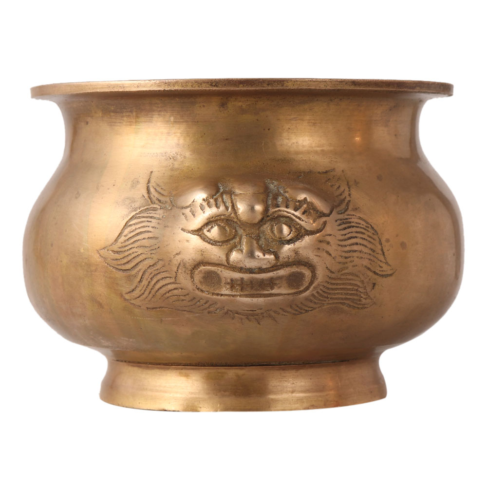 This brass Lota or water pot is traditionally made by skilled craftsmen with their hands. It features two embossed lion faces opposite to each other. The lion face is engraved in Chinese art. It has a stand at the bottom to stay on the surface. The water pots or Lota are used in Hindu rituals to hold sacred water, rice or gold coins. A decorative piece for your home, cafe, bar or hotel. Place them on tables and shelves in your restaurant or hotel to enhance the interior design.