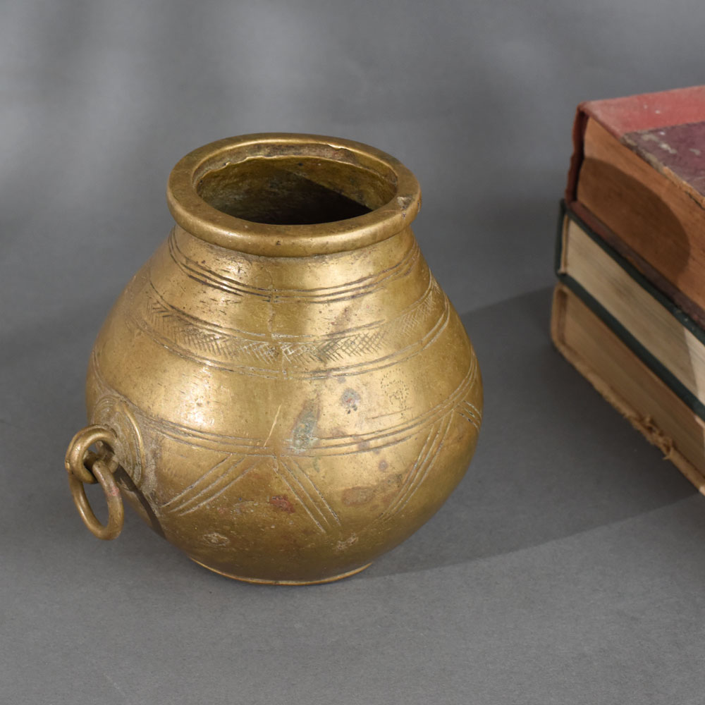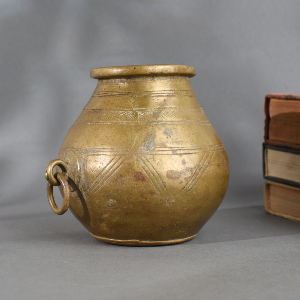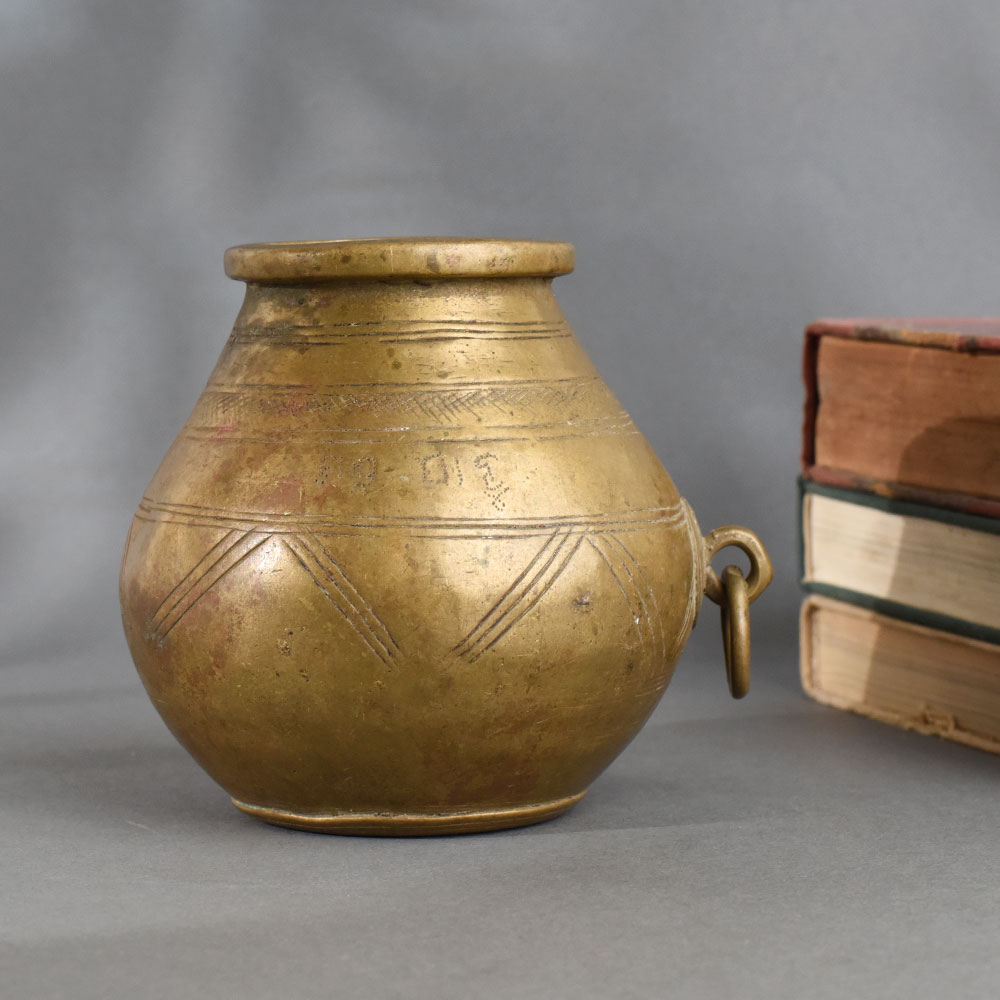 This beautifully handcrafted brass measuring pot from Odisha is a fine example of rural Indian craftsmanship. Traditionally used for measuring grains or pulses, it features simple geometric etchings along the body, including classic triangle bands and horizontal detailing. The natural patina and surface markings add authenticity and rustic charm, while the functional side ring offers a nod to its utilitarian past. Compact and full of character, this pot is perfect for adding a touch of cultural heritage to your home décor, collection, or sacred space.