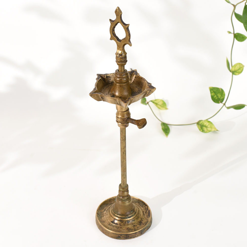 Bring home the warmth, heritage, and spiritual charm of South India with this handcrafted vintage brass oil lamp stand with adjustable height. Designed with traditional motifs and a finely sculpted top finial, this classic lamp stand adds a sacred glow to prayer rooms, festive decor, and heritage-inspired interiors. The rich brass patina enhances its antique appeal, making it an elegant collectible for lovers of South Indian art. The lamp features an adjustable height mechanism, allowing you to raise or lower the diya plate as needed, making it both functional and decorative. Whether used for daily rituals or displayed as a statement accent piece, this oil lamp stand elevates the ambience with its cultural authenticity.