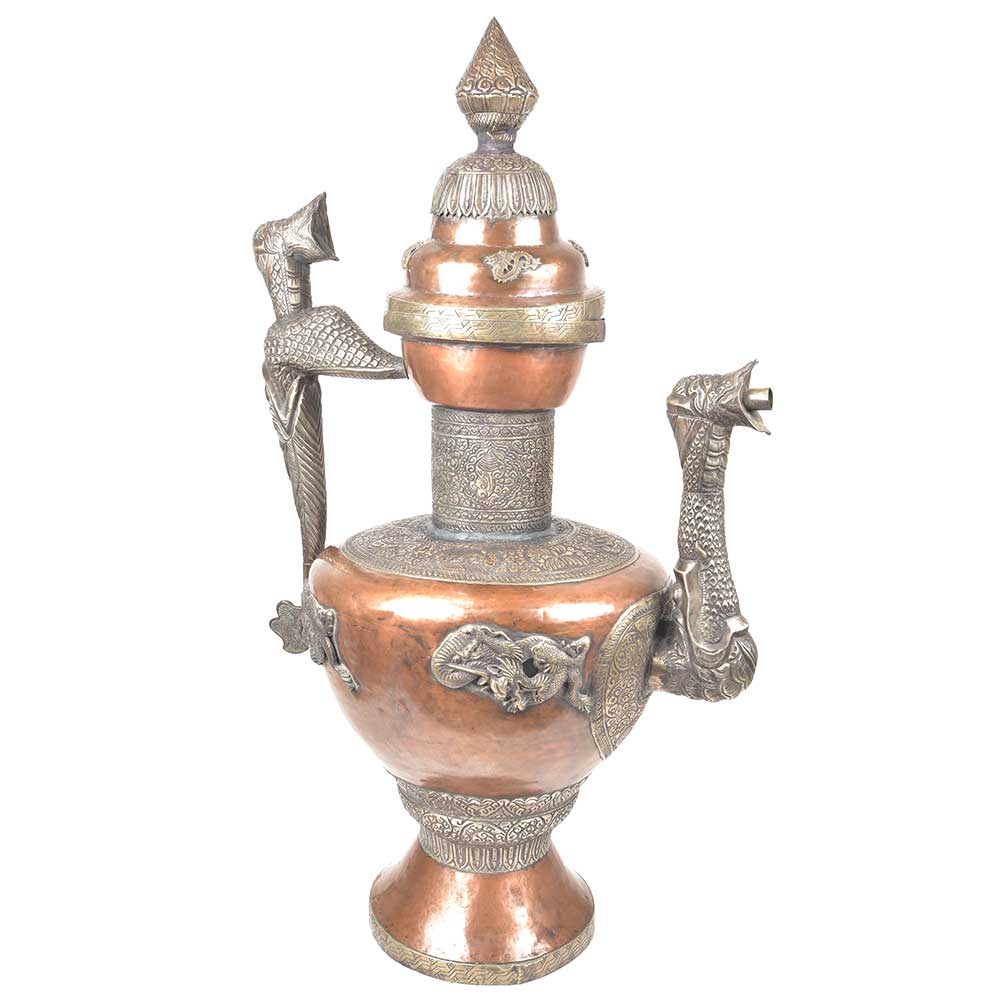 Old Copper & White Metal Inlay Embossed Design Handcrafted Surai / Wine Bottle has beautiful embossed work On bottle has Lid attached with chain use to serve water / wine etc.