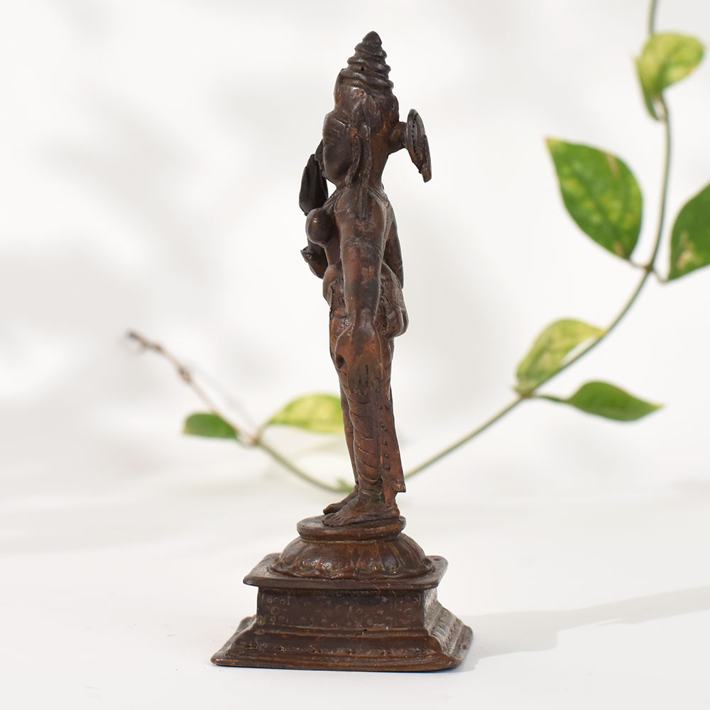 Bring timeless spirituality and artistry into your home with this beautifully crafted vintage copper goddess Uma (Goddess Parvati) statue. Hand-cast in traditional techniques, this figurine displays intricate detailing in the posture, ornaments, and expression, capturing the serene grace of divine feminine energy. Its warm, antique copper finish adds an elegant, heritage-rich appeal, making it perfect for altars, meditation corners, shelves, and curated decor displays. This statue represents craftsmanship that celebrates Indias cultural heritage, making it an ideal piece for gifting, collection, and everyday spiritual use. Whether placed in your pooja room or showcased in a modern interior, it adds a grounding presence and an aura of calm. Perfect for decor enthusiasts, collectors, spiritual practitioners, and anyone who appreciates traditional metal art, this copper goddess figurine enhances your home with beauty, symbolism, and old-world charm.