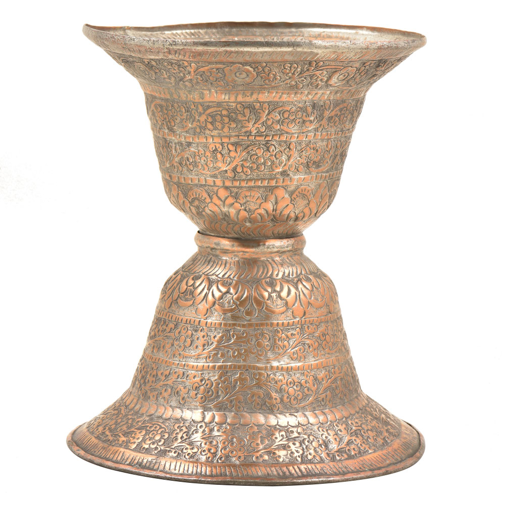 Handmade Copper Ugal-Daa (Spittoon) is a receptacle made for spitting into, especially by users of chewing and dipping tobacco. It can also be used for decoration purposes or as a tray stand. It is fully decorated with repousse or embossed floral design on the entire Ugal daan.