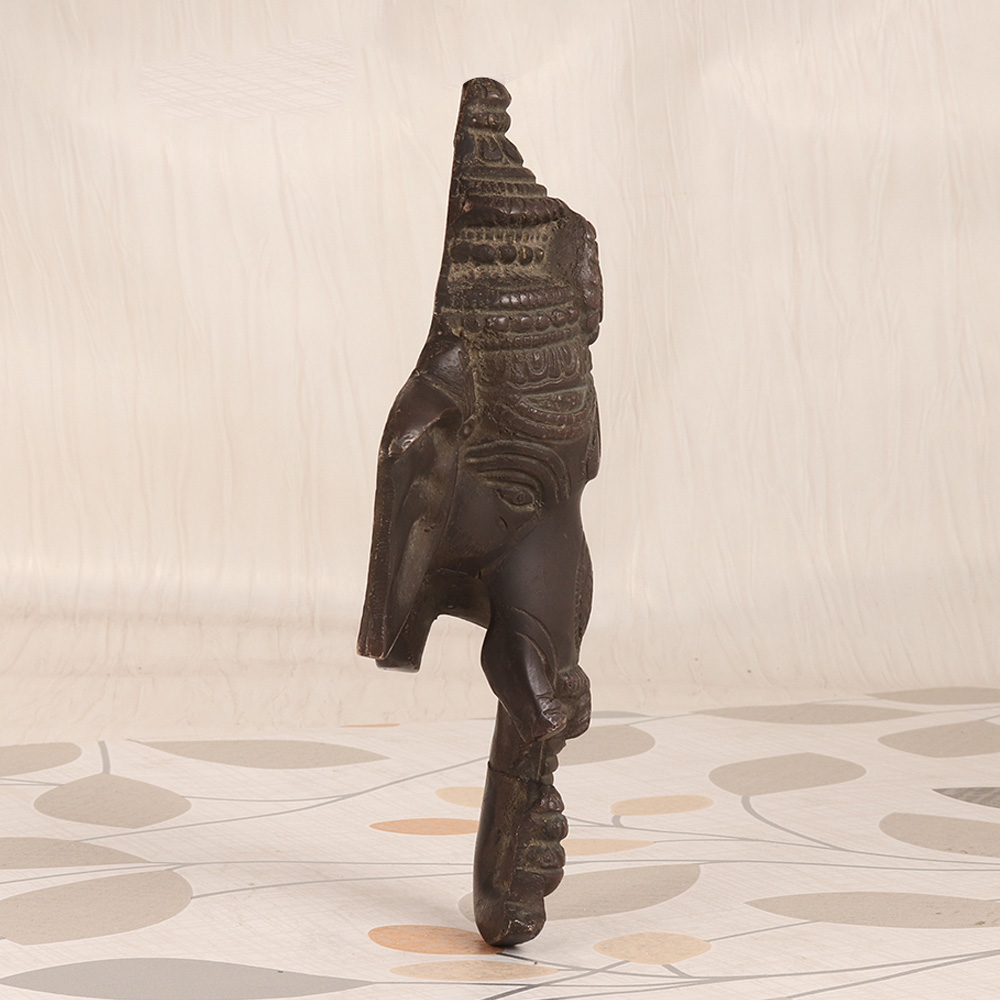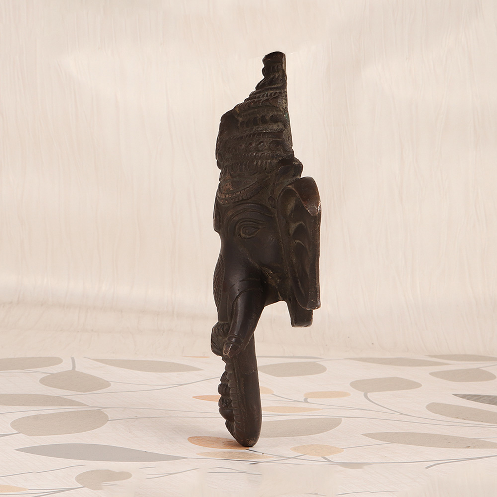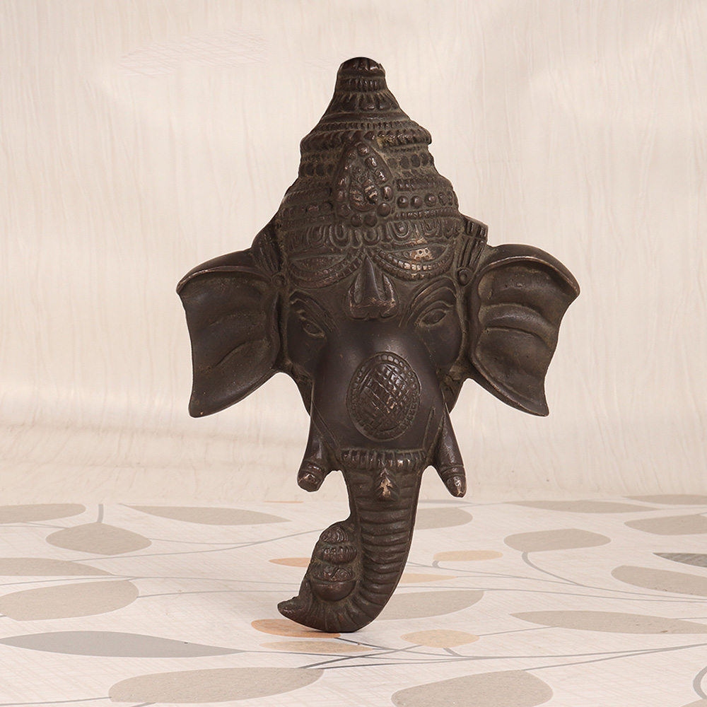 As the remover of obstacles and bringer of good fortune, Lord Ganesha is one of Hinduism's most revered and beloved deities. Now, you can invite his benevolent presence into your personal space with this magnificent brass wall hanging. Crafted by skilled artisans using time-honored metalworking techniques, this striking Ganesha head features an incredibly detailed, three-dimensional design that radiates power, wisdom, and grace. The warm, lustrous brass imbues the piece with a sense of ancient, timeless elegance, making it a stunning focal point that will elevate the ambiance of any room. Whether you're looking to create a serene meditation space, infuse your living room with an uplifting energy, or bring a touch of the divine to your office, this breathtaking Ganesha wall hanging is the perfect addition. Its substantial 12" x 10" size ensures it makes a bold, inspiring statement, while the classic aesthetic seamlessly complements a wide range of decor styles, from modern minimalist to ornate traditional. Invite the blessings of Lord Ganesha into your life and home with this exquisite brass masterpiece, a work of art that pays homage to one of Hinduism's most revered icons and invites his divine energy into your personal space.