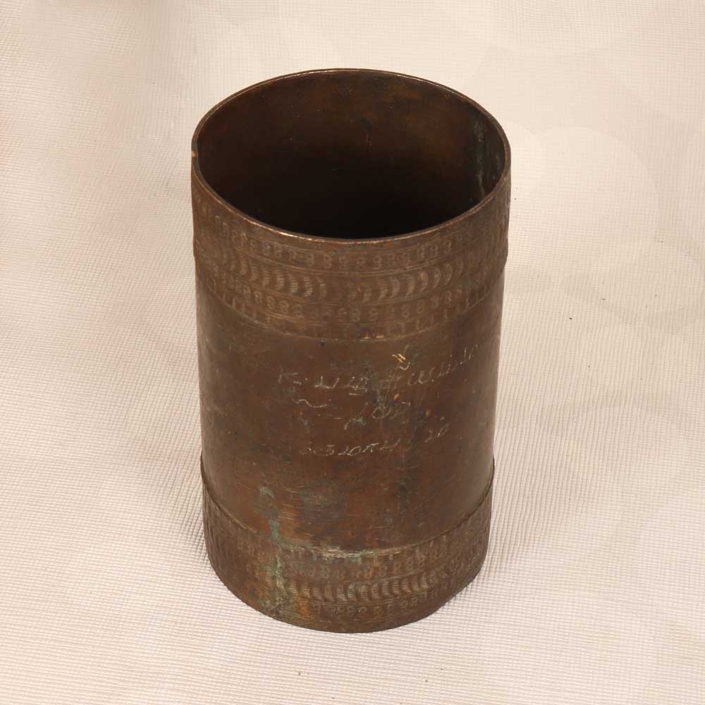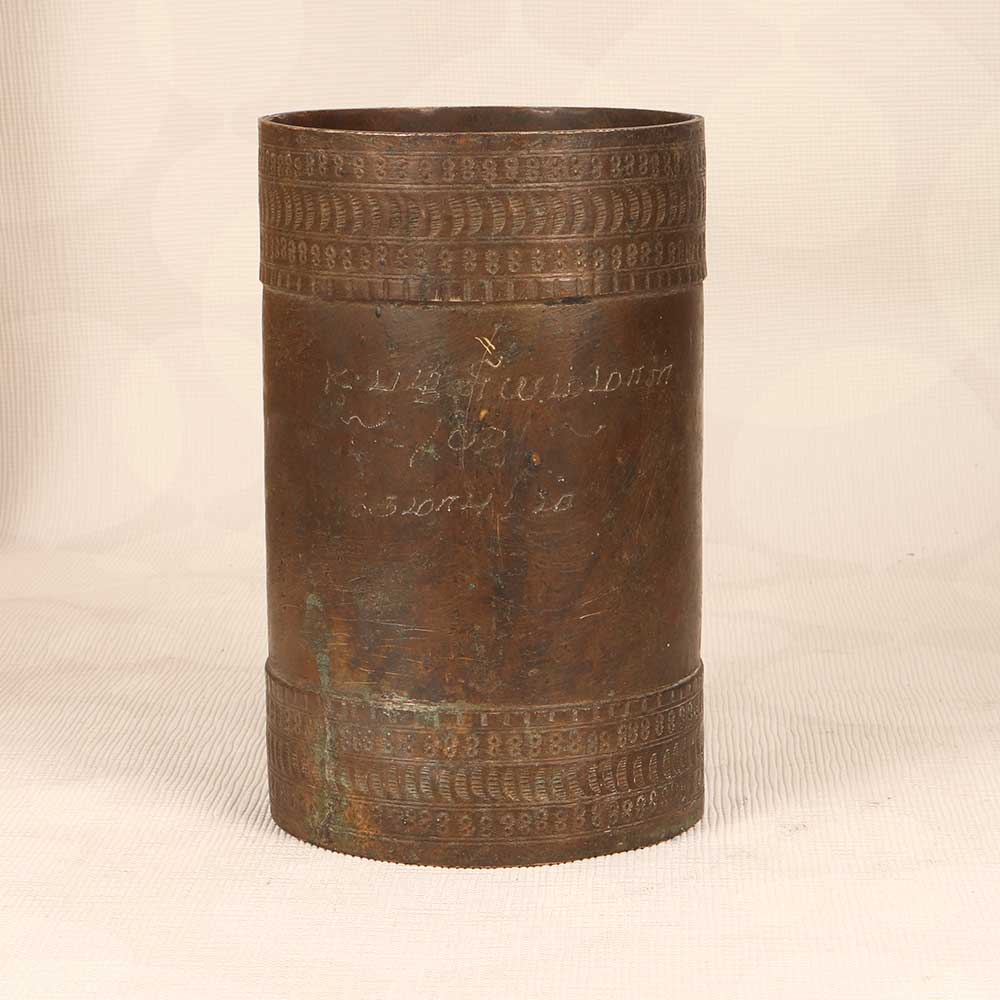 Capture the nostalgia of a bygone era with this gorgeous vintage brass rice measuring bowl handcrafted in South India. With its cylindrical brass shape, minimalist yet substantial design, and rich patina, this decorative piece evokes the traditional homes where similar bowls were once used daily to measure out the proper portions of rice before cooking. Though too delicate for modern kitchen use, this antique bowl makes a stunning accent piece for shelves, tabletops, and more. Its classic styling and glowing, golden hue complements any decor aesthetic, from traditional to contemporary. For those enamored with handicrafts and objects with history, this brass bowl is sure to delight. Display it in your home as a meaningful reminder of beautiful rituals and simpler times. Let its quiet elegance spark imagination and connection across culture and generations. Transport yourself - this vintage bowl brings the past to life.