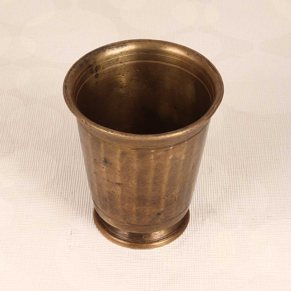 Elevate your home's decor with this exquisite vintage brass holy water cup from South Indian Art. The antique brass finish in plain brown evokes a refined, weathered aesthetic. Whether displayed empty or holding a petite floral arrangement, this cup brings visual intrigue. The pedestal base provides an elegant foundation, allowing the artisanal detailing to shine. Place this cup in an entryway or focal area to immediately draw the eye. The gorgeous brasswork is certain to spark conversation and delight design enthusiasts. For those curating a globally inspired home, this cup provides the perfect touch of India. The handcrafted quality reflects remarkable skill passed down through generations. Let this cup infuse any space with exotic, vintage appeal. An ornamental treasure, it makes cherished decor you'll enjoy for years to come. Give your home a rich, collected look with this striking brass holy water cup.
