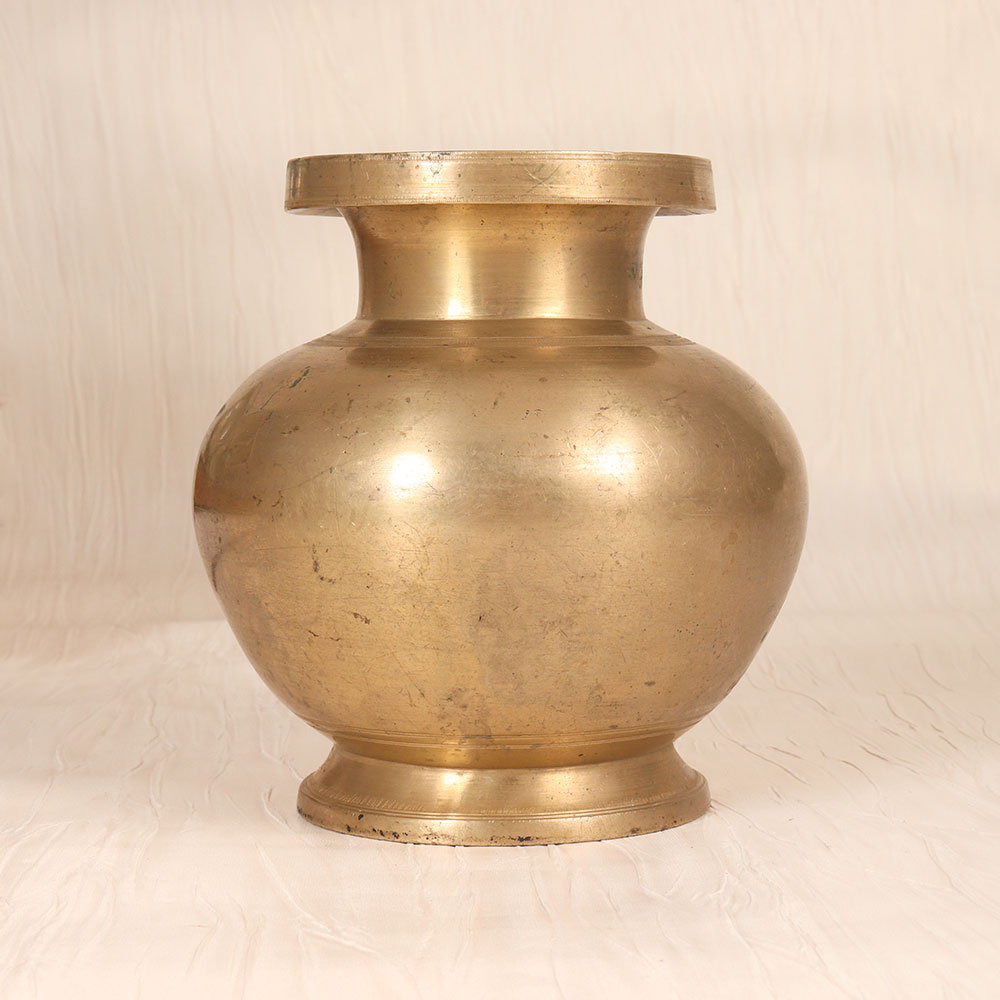 Immerse yourself in the rich cultural heritage of South India with this stunning vintage brass holy water pot. Crafted with meticulous attention to detail, this versatile piece is the perfect addition to your spiritual practice and home decor. Whether you're looking to deepen your personal connection to the divine or simply want to infuse your living space with a sense of tranquility, this brass holy water pot is an invaluable asset. Fill it with consecrated water for your daily puja, or arrange a beautiful bouquet of fresh flowers inside to create a stunning centerpiece. This timeless piece is more than just a functional item - it's a work of art that tells a story. Imagine the generations of artisans and devotees who have used similar brass pots in their sacred rituals over the centuries. By welcoming this pot into your home, you become a part of that enduring tradition, honoring the rich cultural heritage of South India. Invest in this beautiful brass holy water pot and let it become a cherished companion on your spiritual journey, as well as a stunning decorative accent that elevates your living space.