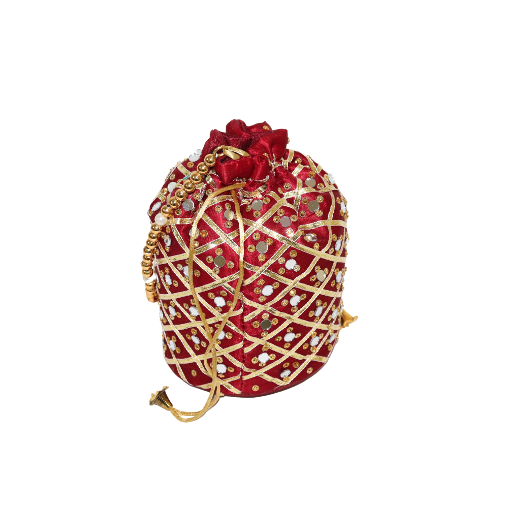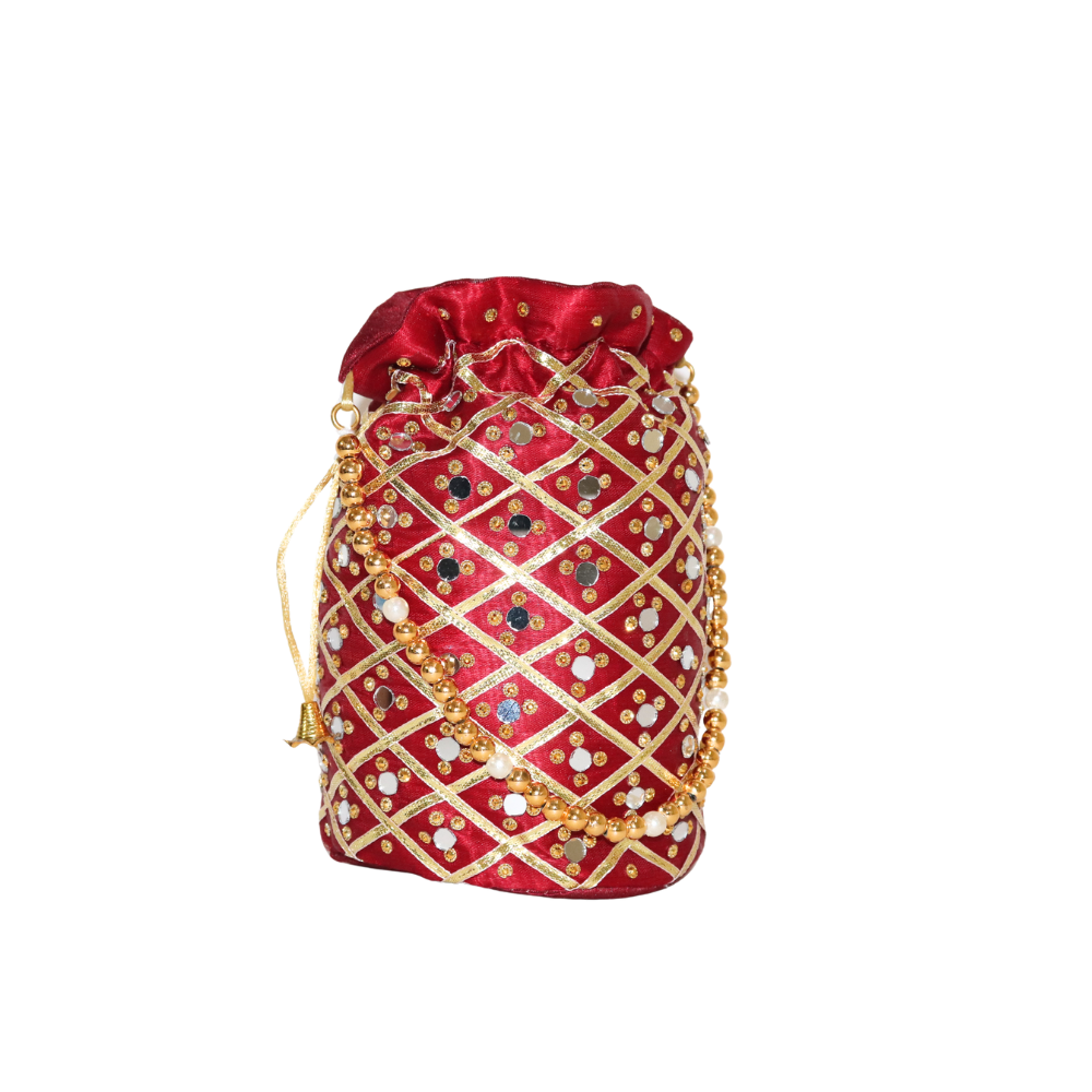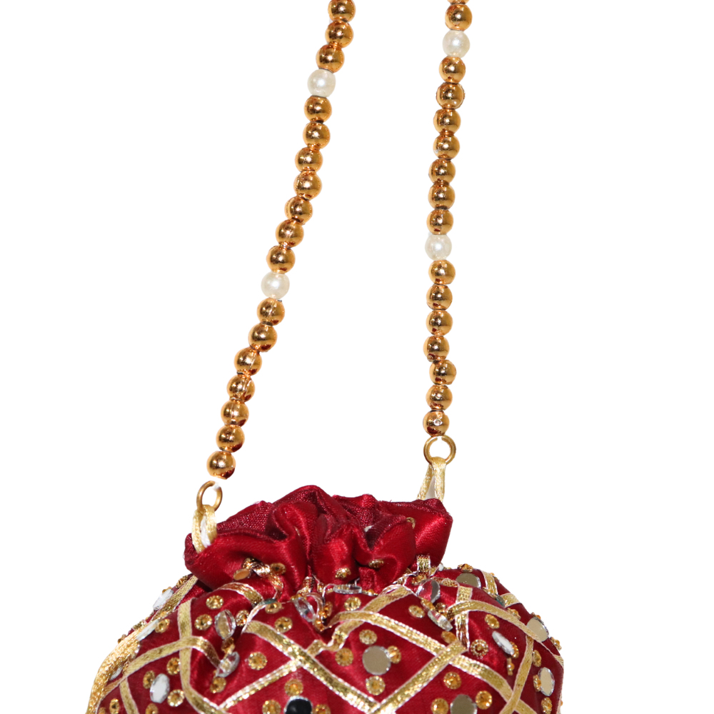 Elevate your accessory collection with this stunning Handmade Cotton Potli Bag, designed with intricate beadwork and mirror embellishments for a touch of glamour. The rich red fabric creates a perfect base for the golden thread work, sparkling beads, and reflective mirror detailing, making it ideal for weddings, festivals, or any special occasion. This traditional potli bag is crafted with care, showcasing the artistry of skilled artisans. The secure drawstring closure adds both style and functionality, ensuring your essentials are safely stored while maintaining an elegant look. Lightweight and easy to carry, this Potli bag is a blend of timeless charm and modern sophistication. Add a pop of color and flair to your ensemble with this exquisite piece that complements ethnic and fusion outfits alike. Perfect as a gift or a personal statement piece, this Potli bag is a must-have in your collection.