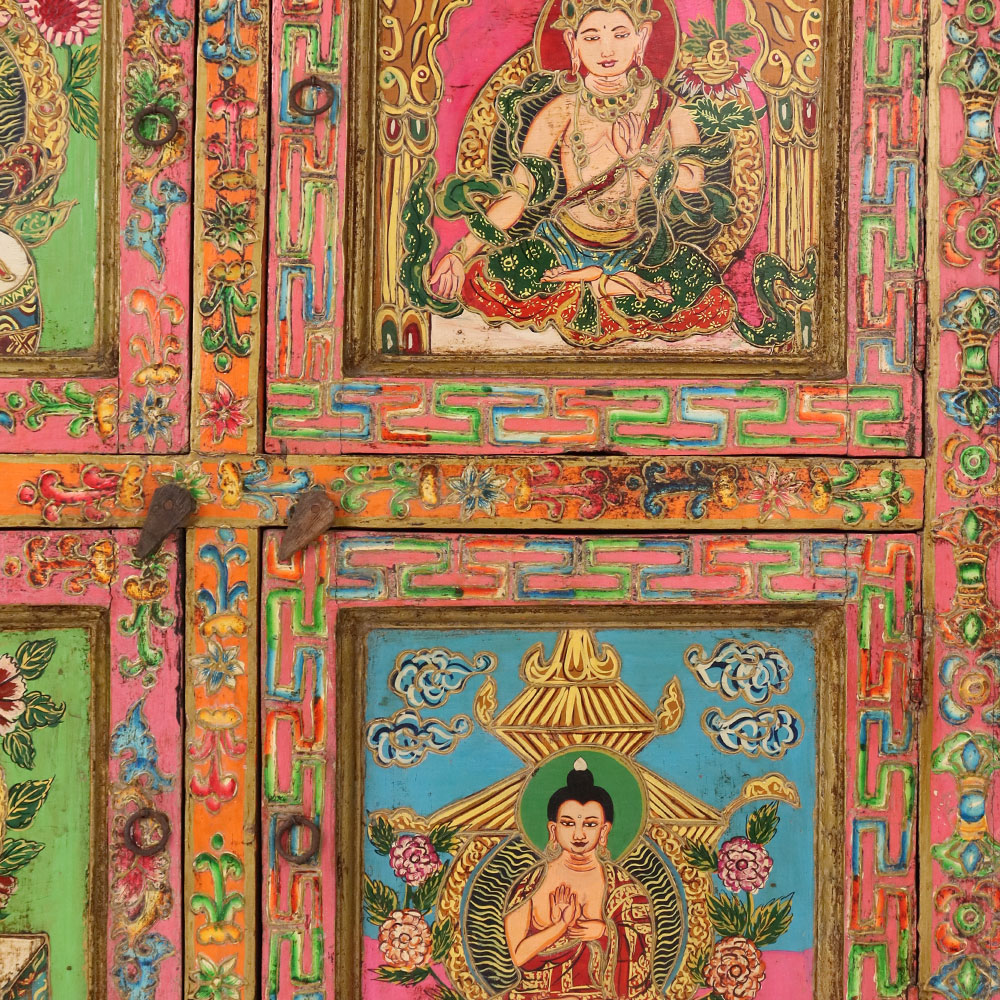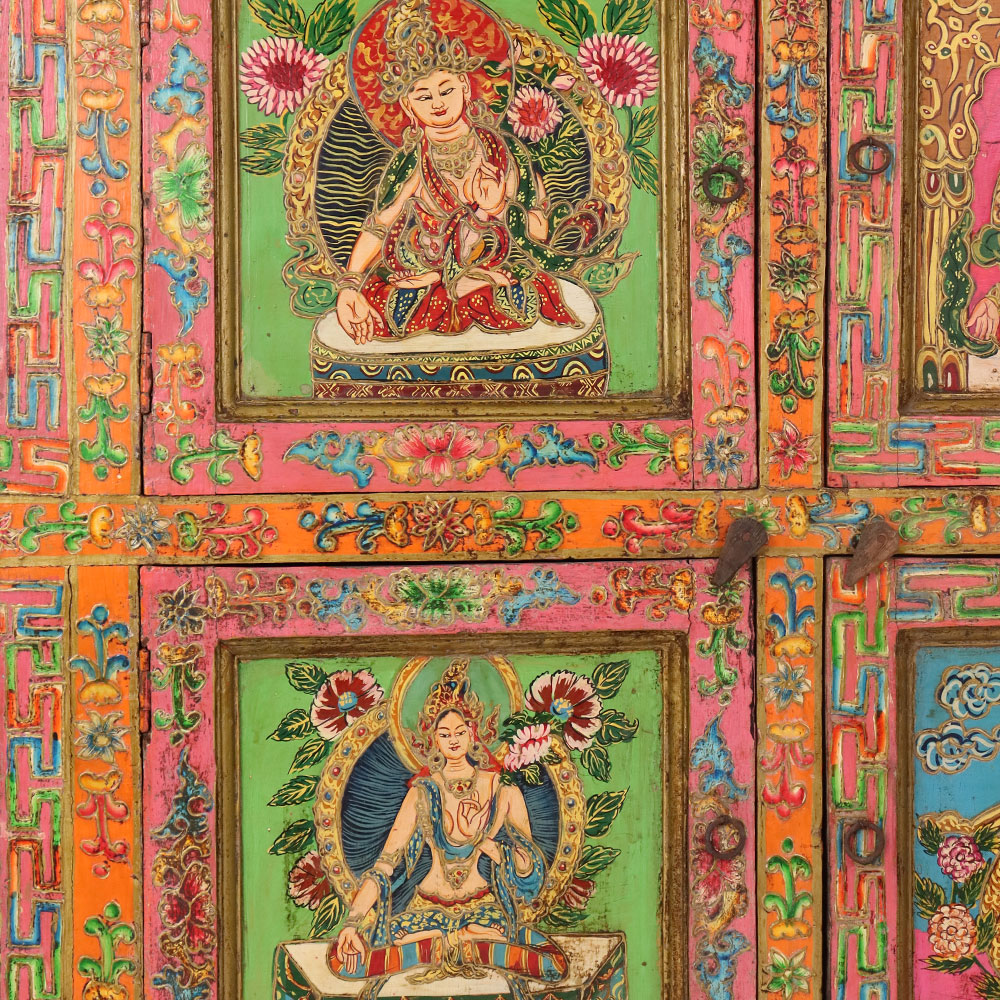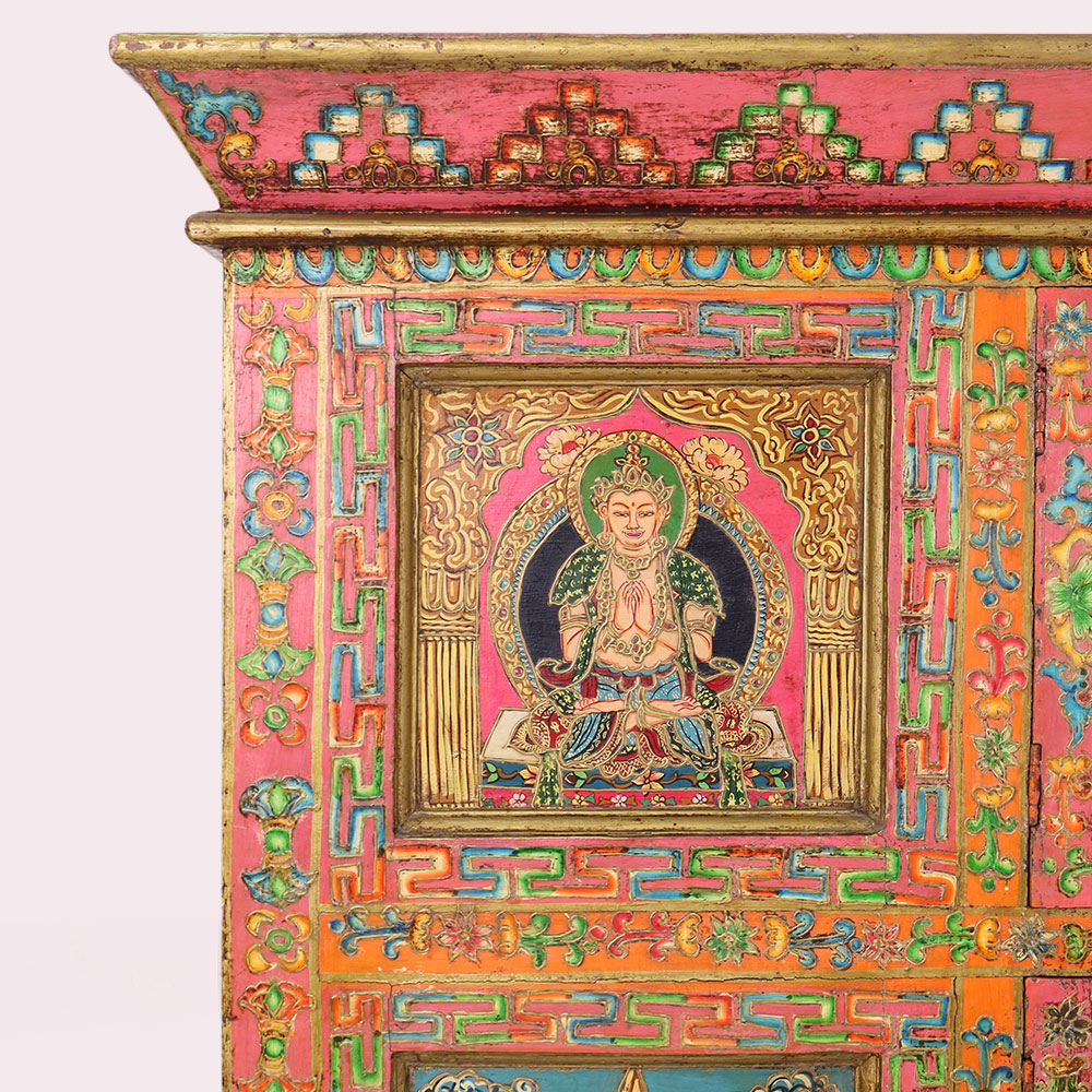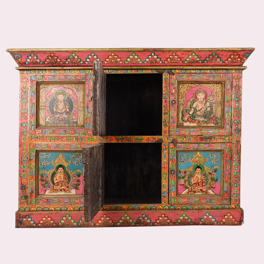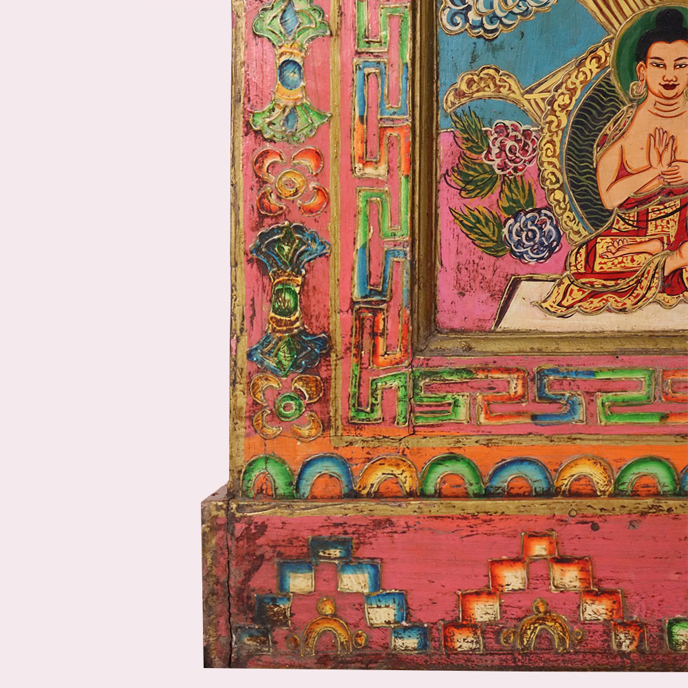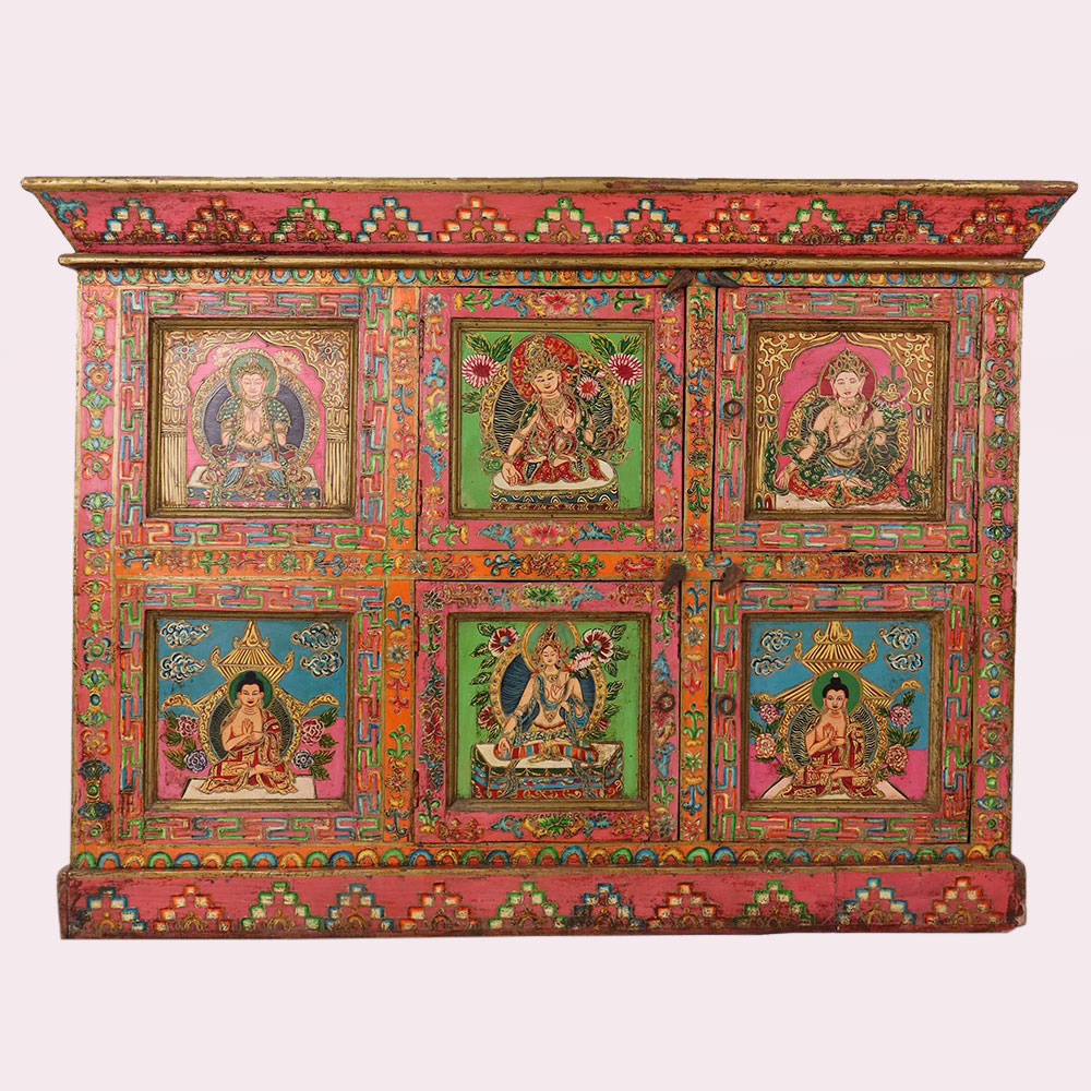 Bring home the elegance of traditional Himalayan artistry with this handmade wooden storage box, beautifully hand-painted with vivid Buddha and deity motifs. Each panel is intricately detailed with floral and geometric borders in rich tones of red, green, blue, and gold, reflecting centuries-old Tibetan painting traditions. The box is more than just storage—it is a piece of spiritual décor that adds color, meaning, and culture to any space. Ideal for storing jewelry, documents, or sacred items, it also serves as a striking collectible for art lovers. Artisan-made and finished with an antique look, this wooden painted box is both functional and timeless.