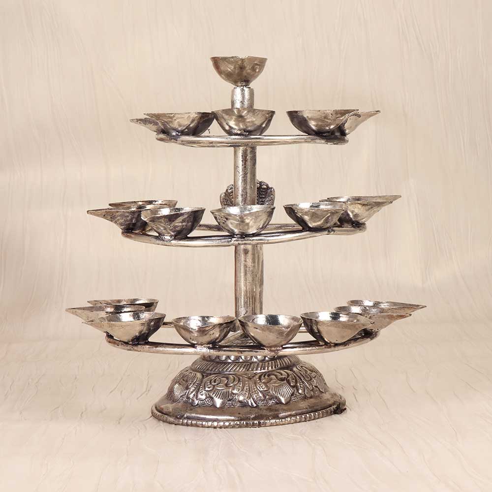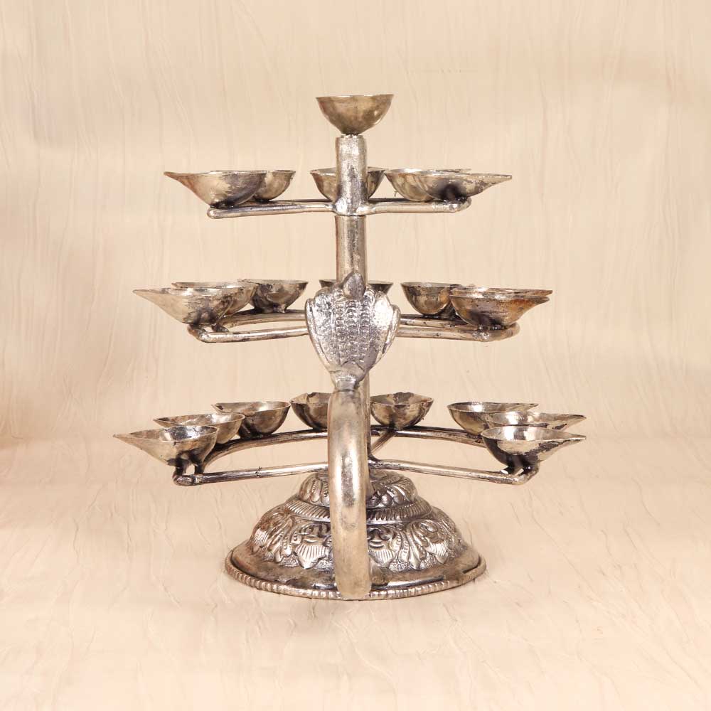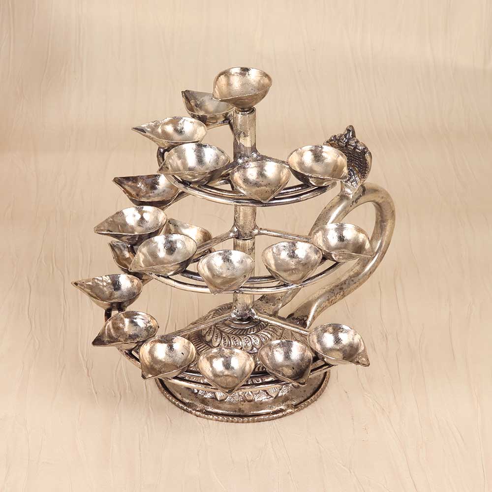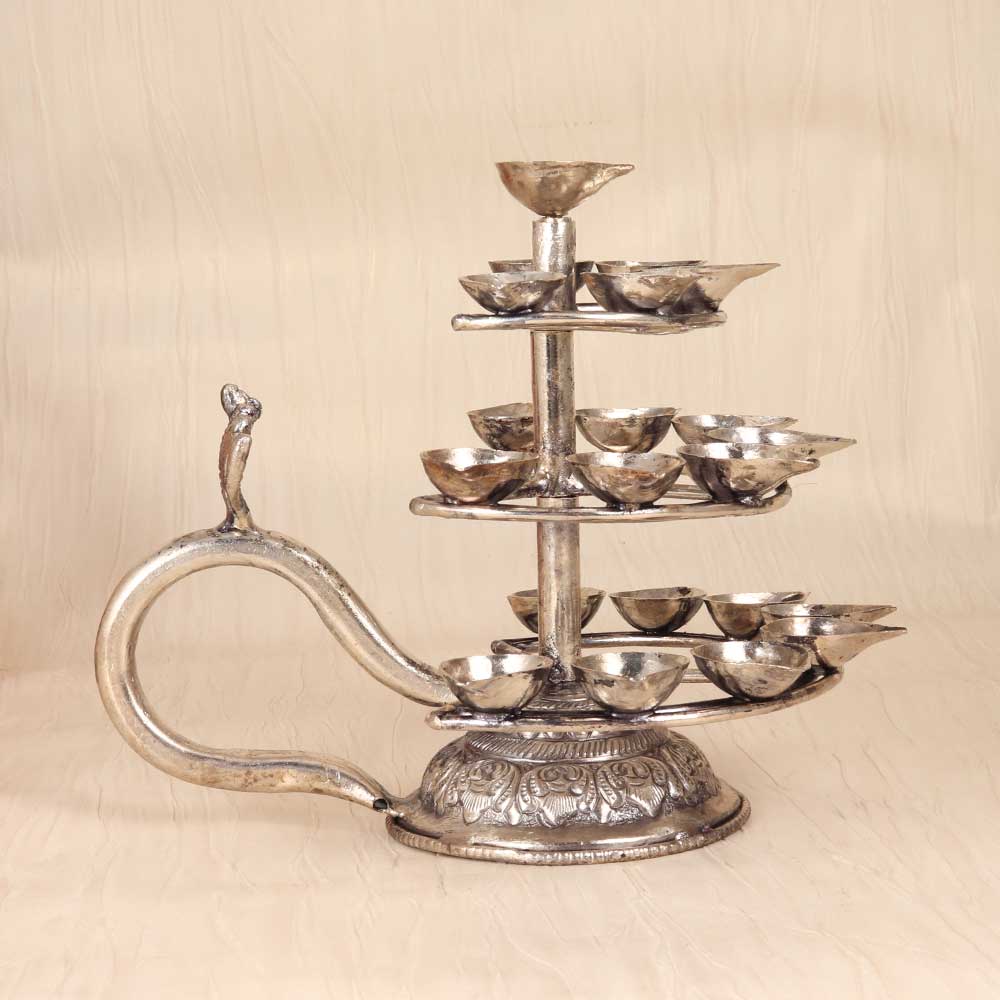 Let the light shine bright in your home with this stunning vintage brass nickel plated aarti oil lamp. With its intricate silver finish and cobra handle design, this lamp makes a gorgeous addition to any puja room or home decor. The lamp can light up to 21 jyots at once using mustard oil or ghee and cotton wicks, bathing your space in a warm, divine glow. This vintage lamp allows you to continue the tradition of performing aarti, all while adding an antique flair to your home. The brass construction ensures durability, while the nickel plating gives it a shiny, polished look. Bring the light of the divine into your home with this gorgeous vintage brass aarti lamp. Its antique design allows you to honor tradition and add visual interest to your space all at once. For those who appreciate unique, vintage-inspired home decor, this lamp is sure to impress.