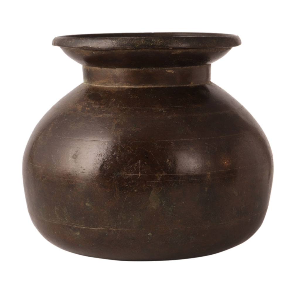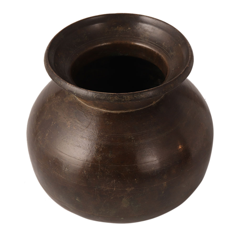 The traditional bronze Gangajal holy water pot has a plain, dark brownish appearance. It has a curved flat bottom. Ideal for decoration at weddings, home, office or spiritual events.