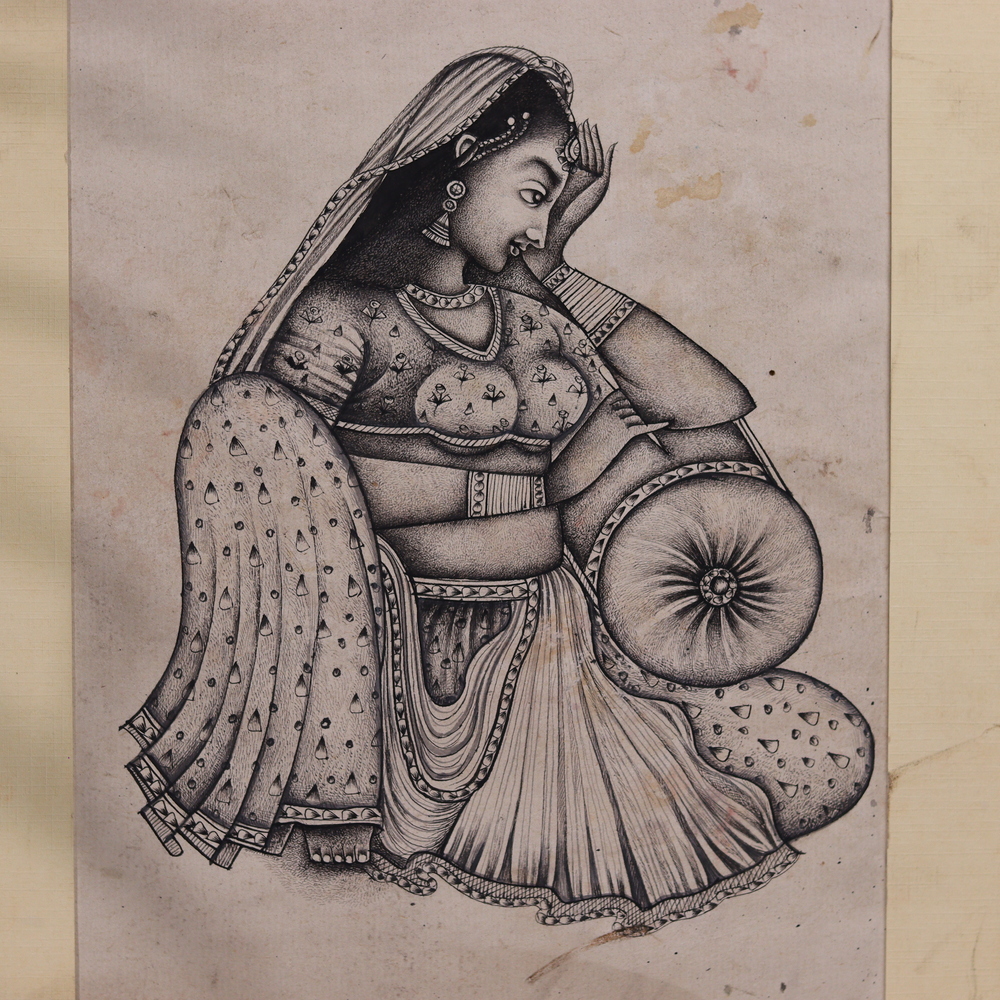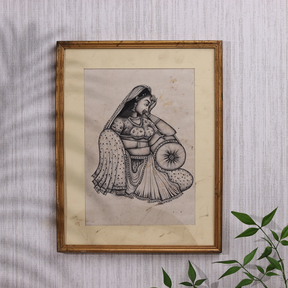 Elevate your space with the captivating beauty of this Vintage traditional Art Indian sitting lady painting. Crafted with meticulous attention to detail, this stunning pencil drawing transports you to the heart of India, showcasing the enduring elegance and cultural richness of a bygone era. This painting is a true masterpiece, celebrating the timeless artistry and cultural heritage of India. The skilled artist has meticulously rendered every delicate fold of the woman's clothing, the intricate details of her jewelry, and the serene expression on her face. Each stroke of the pencil brings this vintage scene to life, inviting you to step back in time and immerse yourself in the captivating world of traditional Indian art. Whether you're a collector of fine art or simply appreciate the beauty of Indian culture, this Vintage traditional Art Indian sitting lady painting is a must-have addition to your home or office. Hang it in a prominent spot and let it transport you to a world of elegance, tradition, and artistic excellence, elevating your space with its timeless charm and cultural significance.