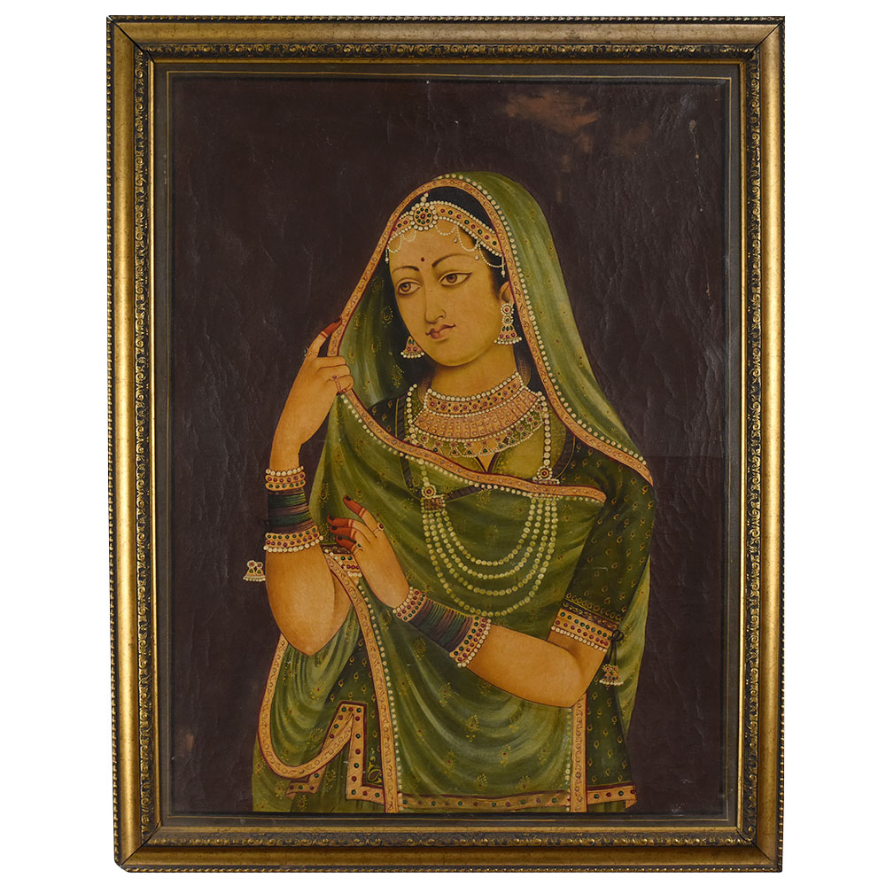 This exquisite canvas oil painting depicts a graceful Indian woman in traditional attire, rendered with meticulous detail and vibrant color. She is shown wearing an elegant green saree with a matching veil, delicately edged in gold and pink patterns. The rich folds of the fabric are adorned with fine decorative motifs, giving the drapery a lifelike texture. Her pose is demure yet confident, with one hand gently adjusting her veil while the other rests near her chest, revealing ornate bangles and henna-decorated fingertips. The woman’s jewelry is opulent, featuring layered pearl necklaces, gem-studded earrings, a maang tikka, and intricate bracelets, all carefully highlighted to catch the light. Her serene face, framed by the veil, is painted with soft, natural tones, and her large expressive eyes convey quiet introspection. The deep brown background enhances the vibrancy of her attire and the luminosity of her skin, creating a striking contrast that draws the viewer’s focus entirely to her figure. The painting reflects the finesse of traditional Indian portraiture, celebrating feminine beauty, cultural heritage, and artisanal craftsmanship. Housed in an ornate gold-toned frame, this piece makes an elegant statement for art collectors, heritage-inspired interiors, or admirers of classical Indian art.