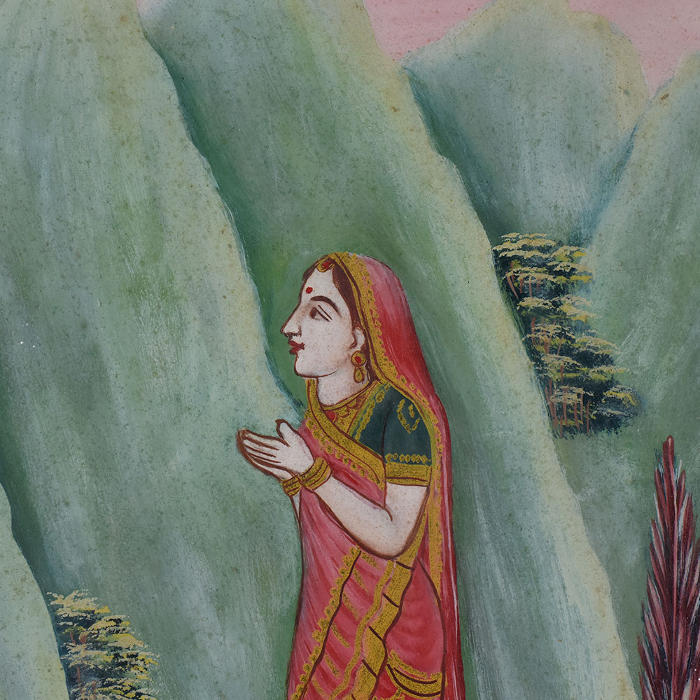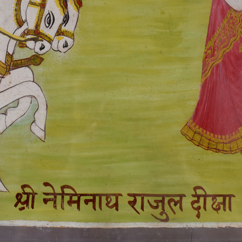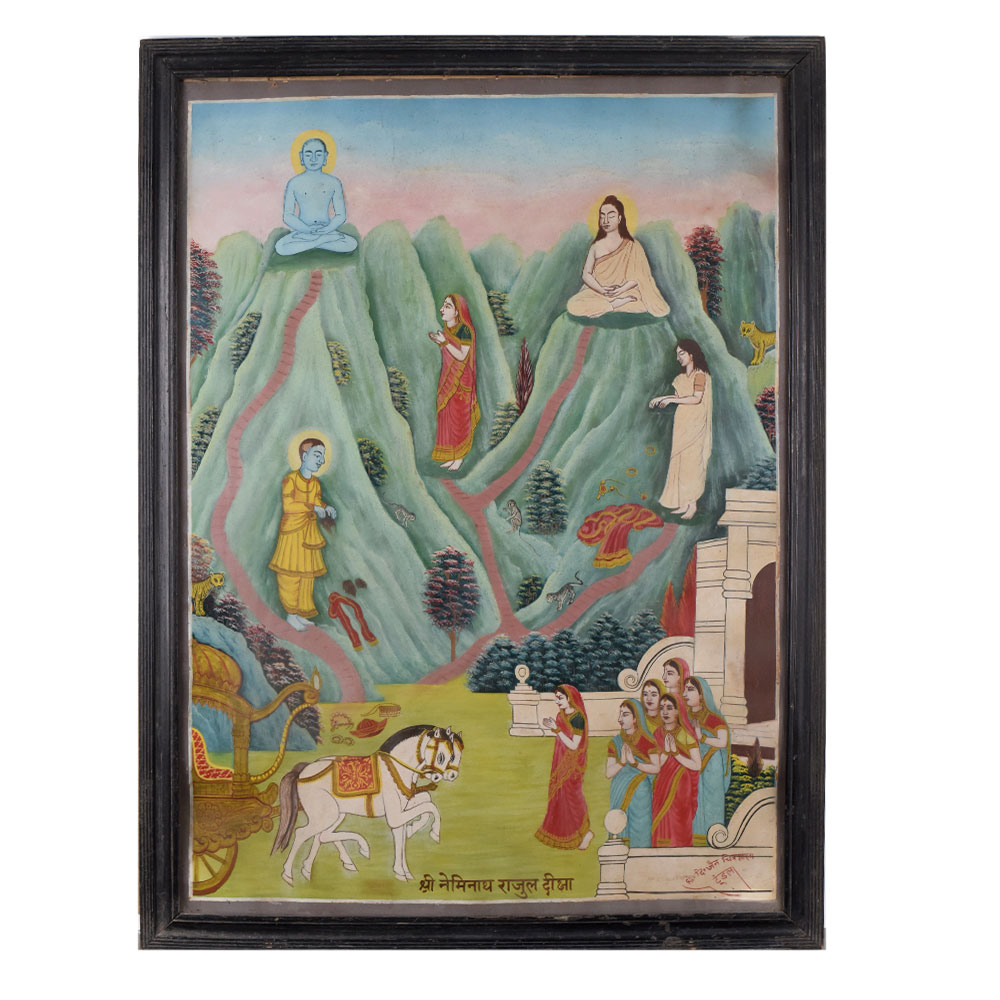 This traditional paper painting on Jain subject beautifully illustrates the spiritual journey of Jain Tirthankaras, created with delicate watercolors. The artwork portrays ascetics, devotees, and divine figures amidst lush green mountains, capturing the deep symbolism and philosophy of Jainism. Each element in the painting reflects devotion, renunciation, and enlightenment, making it a valuable representation of Jain heritage and teachings. With its vibrant palette and intricate detailing, this painting serves as both a devotional piece and a collectible for lovers of Indian religious art. Its vintage charm and cultural depth make it ideal for display in homes, temples, and galleries, enhancing the space with serenity and historical value.