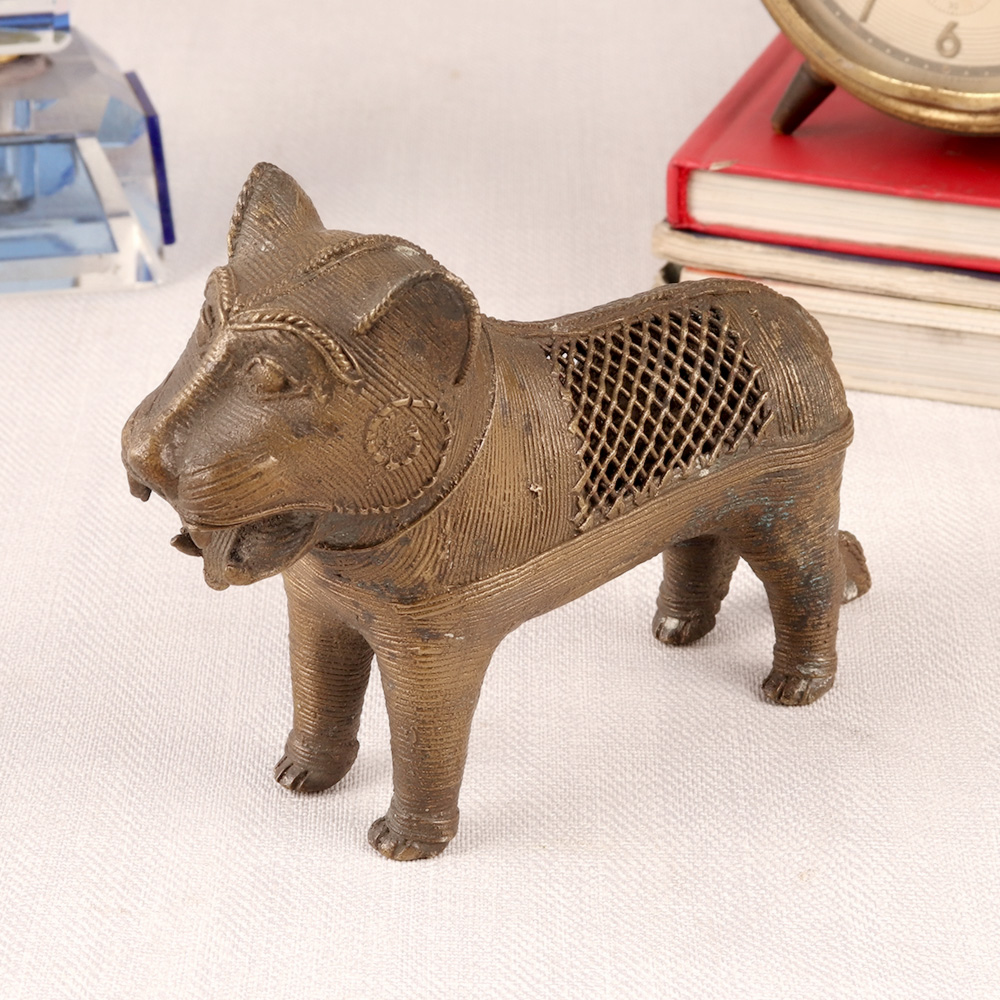 Buy a brass lion statue in tribal art which is a magnificent work of art that is sure to impress any admirer of vintage collections and decorations. The intricate jali work on the statue adds a level of intricacy and detail that is both beautiful and impressive. The tribal art style of the statue is also unique and striking, making it a standout piece in any collection. Its brass material gives it a timeless look that is sure to complement any decor style. Whether you choose to display it on its own or as part of a larger collection, this lion statue is sure to become a conversation starter. Its impressive size and stunning details make it a must-have for any lover of vintage and tribal art.