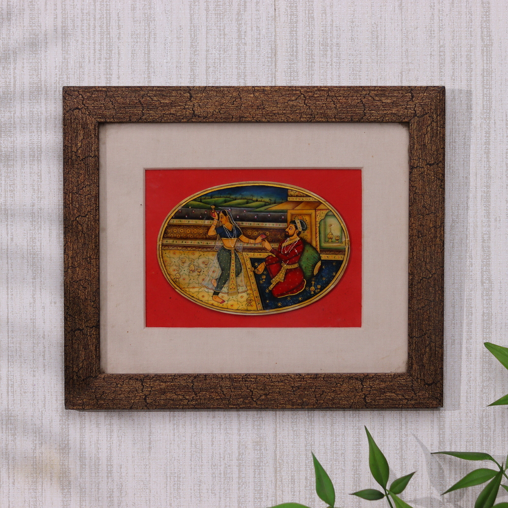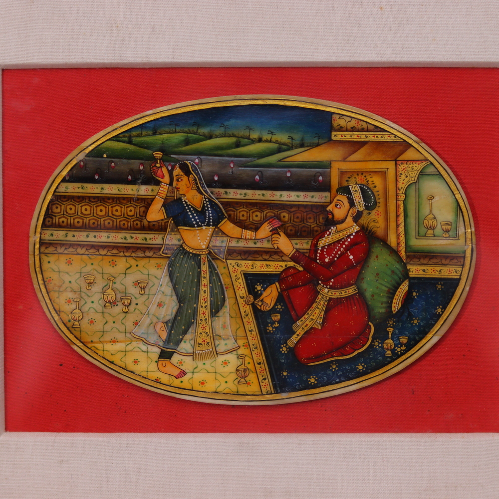 Discover the captivating artistry of traditional Indian painting with this exquisite piece on a camel bone plate. Crafted using natural stone colors and meticulous attention to detail, this work of art showcases the rich cultural heritage and timeless beauty of Mughal-inspired motifs and patterns. This painting is more than just a decorative item - it's a testament to the enduring legacy of Indian art. The Mughal-inspired design, with its intricate patterns and harmonious color scheme, has been expertly rendered to capture the essence of this timeless aesthetic. The natural stone colors, ranging from warm ochres to deep jewel tones, lend a depth and vibrancy that will captivate the senses and elevate any room. Whether you're a seasoned collector or simply someone who appreciates the beauty of authentic craftsmanship, this Indian painting on camel bone is a must-have addition to your home. Display it proudly as a centerpiece, or give it as a thoughtful gift that will be cherished for years to come. Immerse yourself in the timeless elegance of Mughal-inspired Indian art and transform your space with this truly remarkable piece.