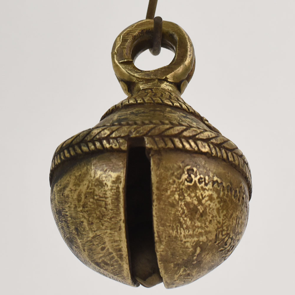 This traditional vintage cow bell from Northern India embodies centuries-old metalworking techniques and rural heritage. Crafted from bell metal, it has developed a richly toned patina featuring golden bronze hues interspersed with darker textured areas. Its signature rounded base and handcrafted looped handle reveal the skill of local artisans who shaped functional everyday tools with artistic sensibility. Today it serves as a charming dcor statement, perfect for rustic, artisanal, and culturally inspired interiors. Use it in entryway dcor, wall displays, or craft projects for a touch of authenticity. Its organic imperfections and aged appearance make it a treasured collectible object.
