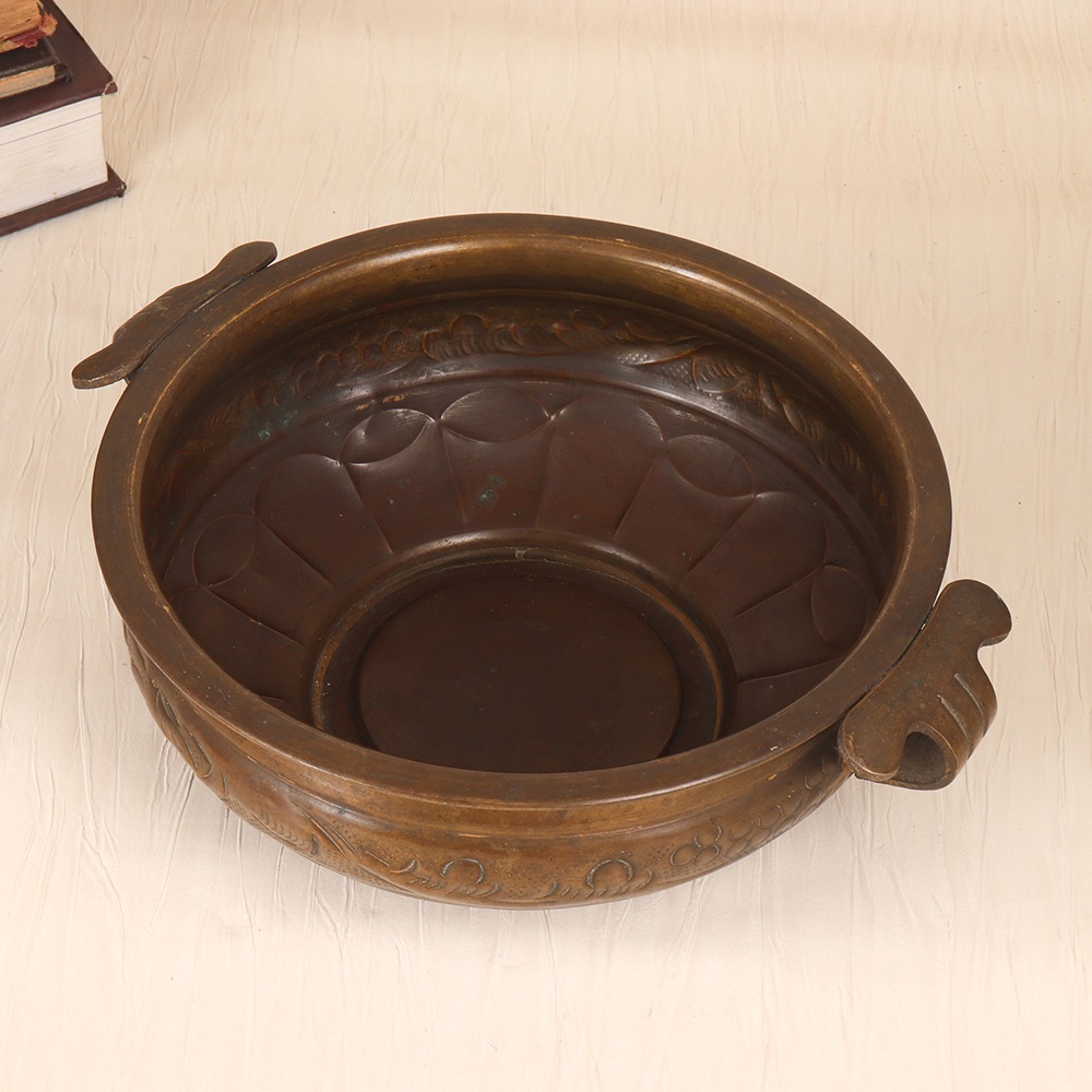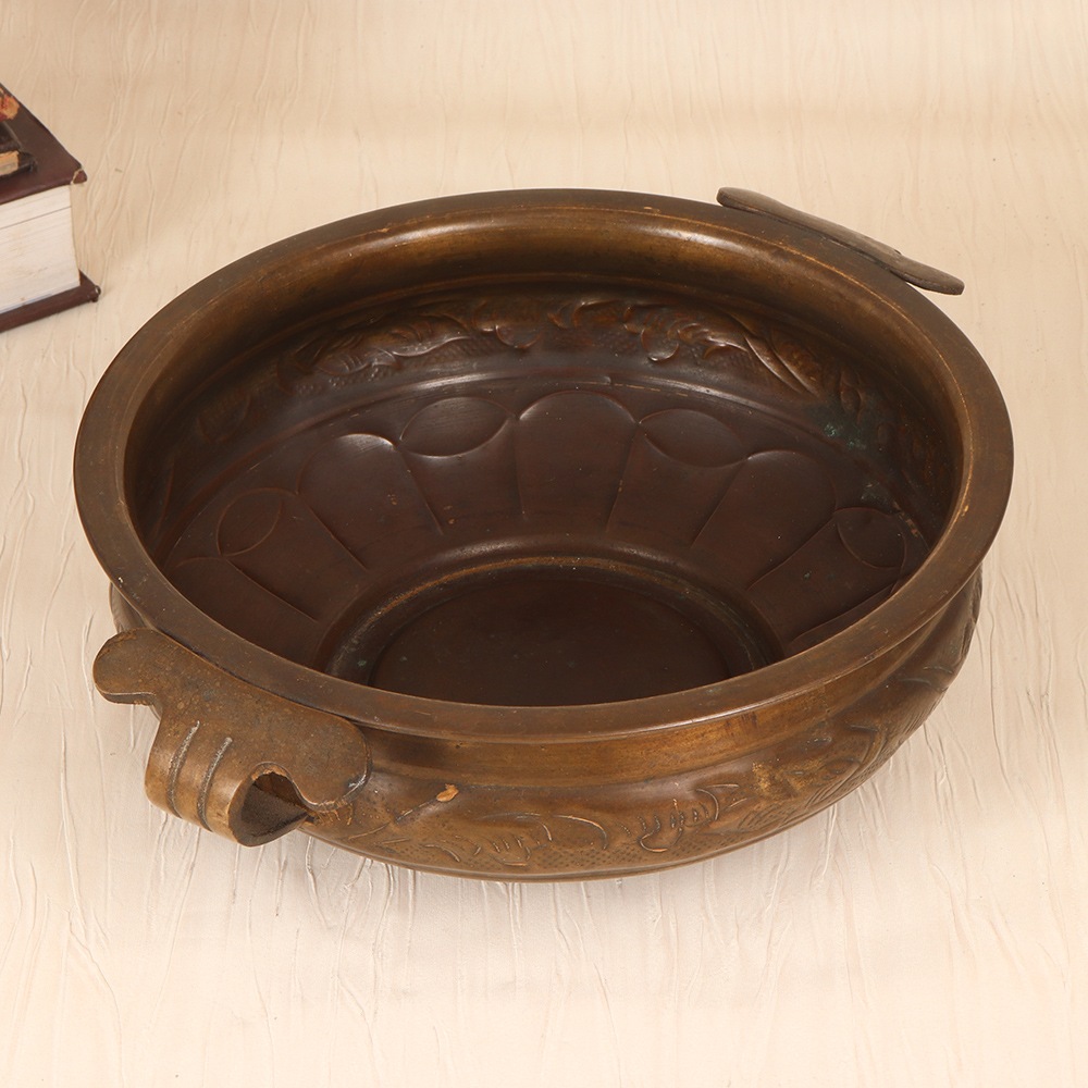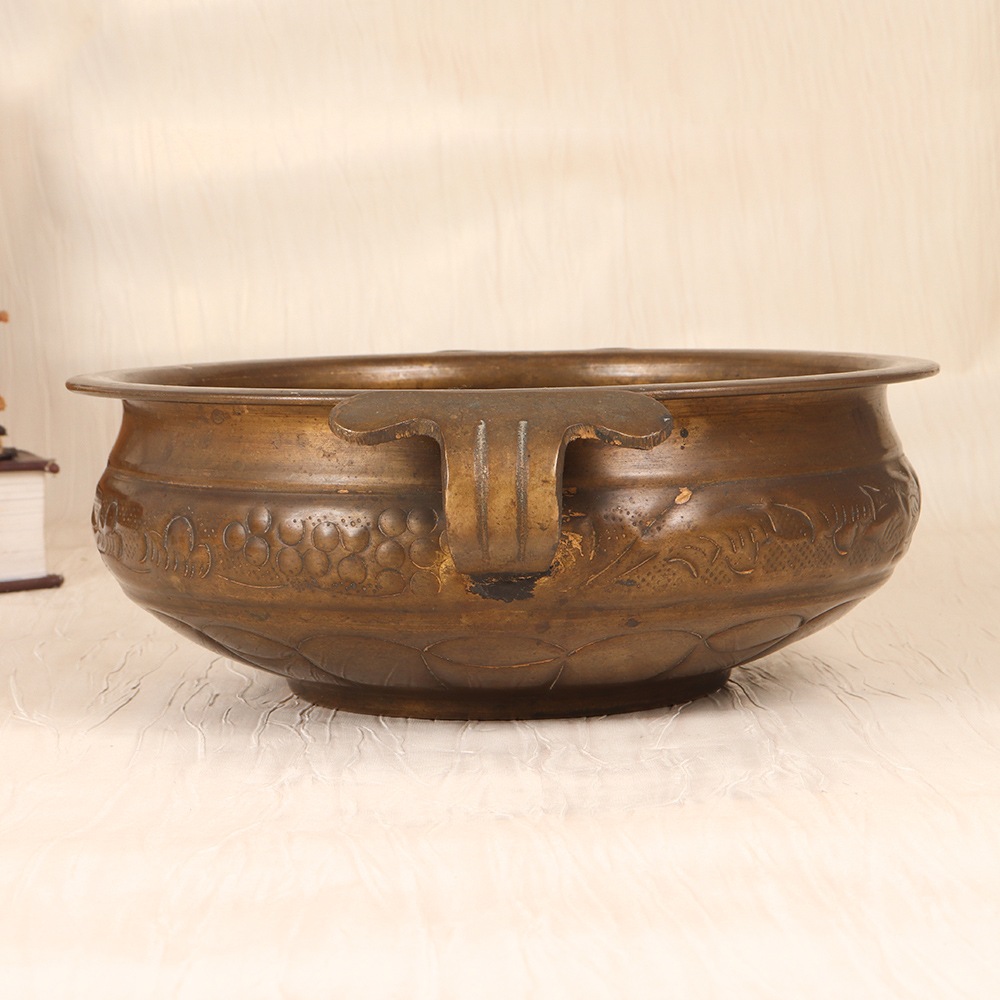 Elevate your home decor with the captivating presence of this vintage brass Urli. Meticulously crafted with intricate engraving and dual handles, this stunning piece is a true testament to the enduring artistry of ancient Indian design. This Urli emanates a warm, golden glow that instantly enhances the ambiance of any space. Use it to beautifully display flowers, candles, or other treasured items, or let it shine as a sculptural work of art in its own right. Whether you're drawn to the rich history and cultural significance of this piece or simply appreciate its timeless elegance, this Urli is a must-have for those who cherish handmade, heritage-inspired home accents. Bring the beauty of ancient India into your modern abode and enjoy the way this Urli transforms any room into a sophisticated, welcoming haven that reflects your refined taste and appreciation for the artistry of the past.