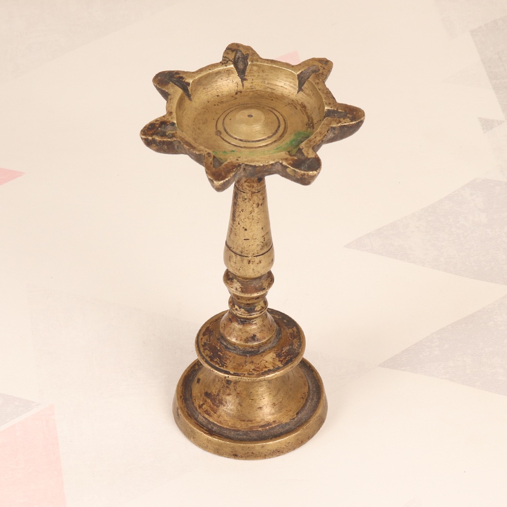 Step into the enchanting world of traditional South Indian lighting with our exquisite vintage brass oil lamp. Crafted with meticulous attention to detail, this stunning 7-jyot lamp is a testament to the region's rich cultural heritage, casting a warm, flickering glow that will transport you to a world of timeless elegance. Imagine the mesmerizing dance of flames illuminating your living room, bedroom, or meditation nook. This brass oil lamp doesn't just light up a room - it ignites the senses, evoking the comforting aromas of natural oils and the tranquil essence of a bygone era. Whether you're seeking to create a sanctuary of calm or add a touch of vintage charm to your decor, this captivating lamp is a must-have. Elevate your space and reconnect with the timeless traditions of South India. Invest in the enduring beauty of our vintage brass oil lamp, and let its enchanting glow inspire you to slow down, savor the moment, and bask in the warmth of a simpler time. Embrace the allure of brass and let its captivating light transform your world.