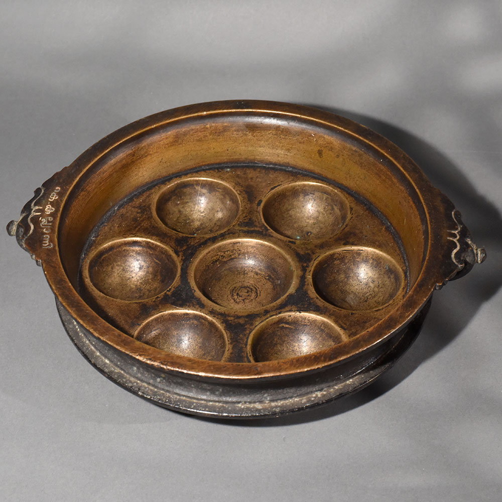 This vintage South Indian brass idli making pot is a striking example of traditional cookware shaped by everyday rituals and regional craftsmanship. Made entirely from solid brass, this vessel was created for slow, even steaming over traditional stoves, ensuring soft and perfectly formed idlis. Its substantial weight and balanced proportions reflect a time when kitchen utensils were built for durability and repeated use across generations. The pot is designed with seven deep, rounded idli cavities, carefully formed to distribute heat evenly and retain steam during cooking. Each mould carries gentle signs of wear, adding to the authenticity and charm of the piece. The interior surface shows a beautifully aged patina, developed naturally over years of use, giving the brass a warm, earthy tone that cannot be replicated in modern reproductions. Decorative side handles enhance both function and form, allowing the pot to be lifted safely while also adding a subtle ornamental detail. A raised outer rim helps secure the vessel when placed inside a larger steaming pot, making it a thoughtfully engineered kitchen tool. Today, this idli pot transcends its original purpose and works wonderfully as a heritage display object, a collectible for antique enthusiasts, or a statement accent in rustic and traditional interiors. Whether showcased in a kitchen, placed on open shelving, or incorporated into a curated decor setup, this piece evokes memories of home cooking, communal meals, and South Indias rich culinary traditions.