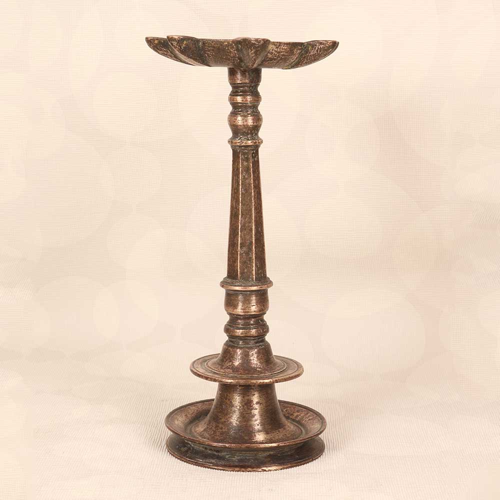 Radiate the mystical aura of ancient India with this hand engraved vintage brass oil lamp. The elegant lamp holds 7 cotton wicks, representing the 7 chakras. Fill with mustard oil or ghee to light all 7 flames, creating a warm, spiritual glow. This authentic lamp is crafted in the traditional style of South Indian Art. The solid brass base depicts intricate engravings of traditional motifs. Each lamp is individually hand engraved by skilled artisans, ensuring a one-of-a-kind piece. Bask in the tranquil ambiance created by the lamp's flames. They provide the perfect lighting for yoga, meditation, or just unwinding. The mesmerizing glow transports you to an ancient era filled with serenity. A special gift for the world traveler, history enthusiast, or anyone seeking an authentic Indian artifact.
