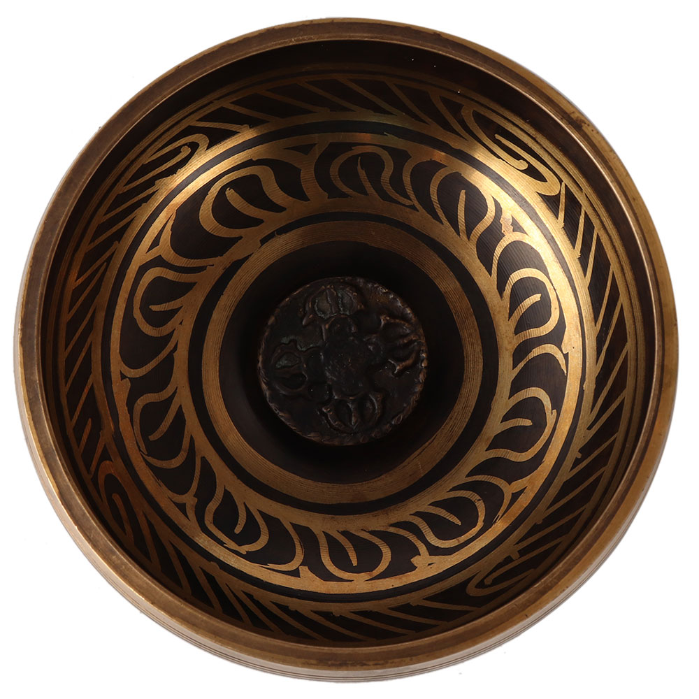 An incredibly carved Tibetan Om singing bowl made of a bell metal alloy. It is engraved with motifs and words in Tibetan language. It has an attractive design and a traditional look. Tibetan singing bowls have been used for centuries for deep relaxation, meditation, muscle regeneration and for various medical practices. You can use the singing bowl with water to create various resonant vibrations and sounds. You can also use it as a decorative piece to enhance your home interior. Give it as a gift to your loved ones.