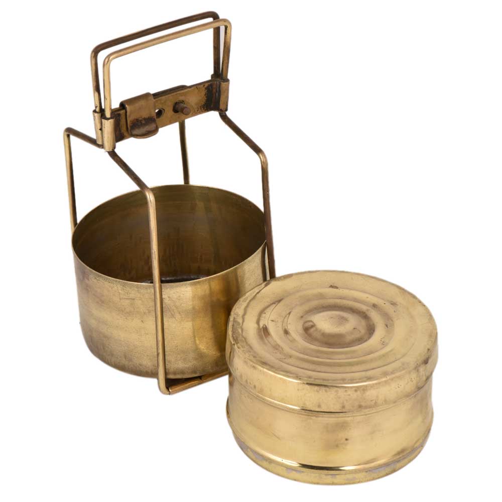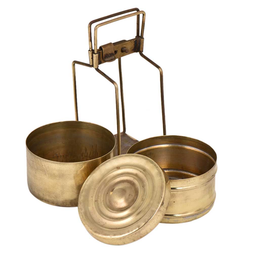 This is a handmade brass lunch box with two containers and a thin brass strap with a traditional locking system which were very popular in earlier times .The brass frame keeps the entire container intact and gives a nice shape to the Tiffin . Use it as a home decoration product, table ornament, and jewelry storage or in the presentation of food for food bloggers.