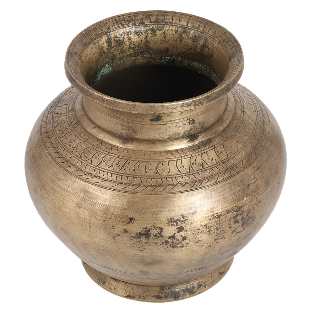 This traditional Kalash or holy water pot is carved from brass alloy. It has been engraved with patterns. Use this vintage Kalash as a Purna Kalash in Hindu rituals. A Purna Kalash is a Kalash filled with water, rice or gold coins. Mango leaves are placed on top so that they touch the water, and a coconut is placed on the top facing the sun. It is used in rituals and auspicious events. Beautify your home with this vintage style Kalash.