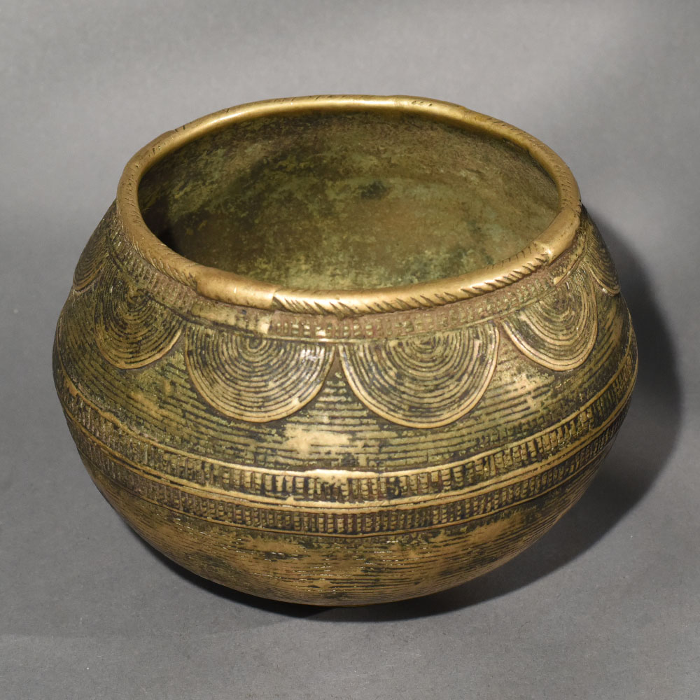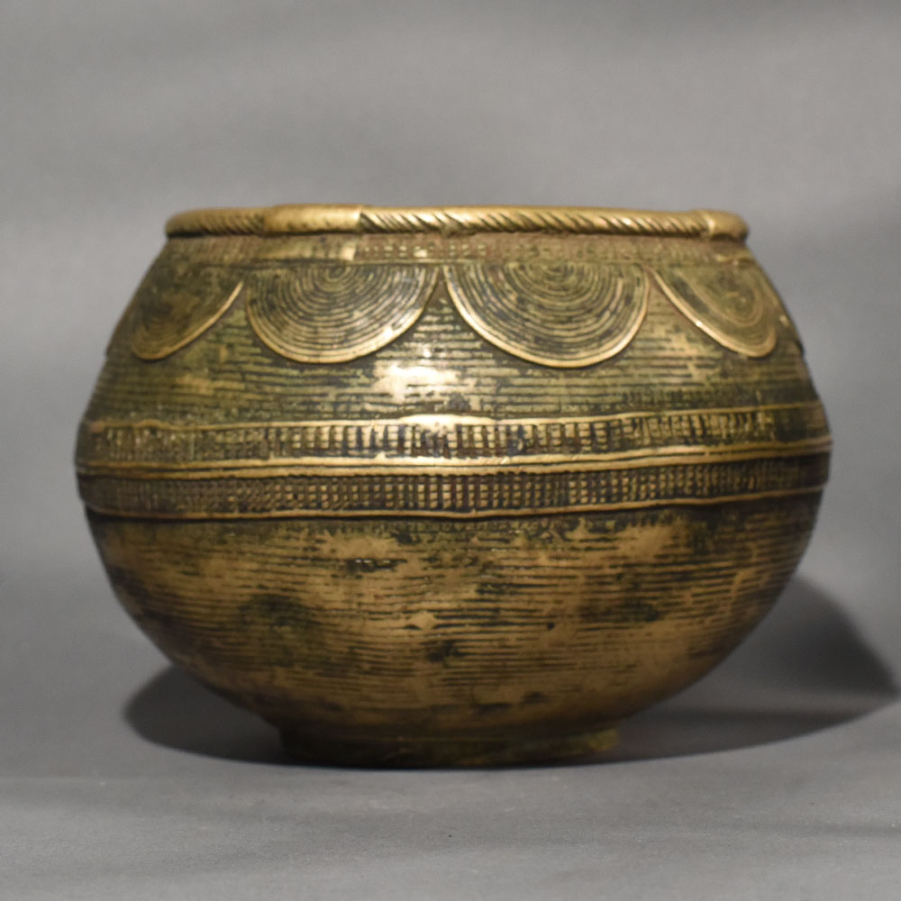 This vintage brass rice measurement bowl from Odisha represents the deep connection between daily life and craftsmanship in traditional eastern Indian households. Such bowls were once essential tools in kitchens, granaries, and local markets, where rice and grains were measured by volume rather than weight. Made from solid brass, the vessel reflects a time when functional objects were built to last generations and carried cultural value beyond their everyday use. The form is broad and rounded, with a generously open mouth that allowed for easy filling and leveling of rice. The exterior surface is richly embellished with hand-engraved patterns arranged in horizontal registers. Repeating arched motifs, fine linear textures, and subtle geometric bands wrap around the body, creating a sense of rhythm and balance. A thickened rim reinforces the structure while also giving the bowl a strong, grounded presence. Over time, the brass has developed a beautiful aged patina, blending muted gold tones with darker areas that highlight the engraved details. This natural wear adds depth and authenticity, making each mark a quiet record of long-term use. Today, the bowl works equally well as a decorative accent, ideal for holding potpourri, serving as a planter, or standing alone as a sculptural object in a curated interior. More than a utilitarian vessel, this piece is a tangible reminder of Odishas metalworking heritage and agrarian traditions. Its handcrafted character and historical purpose make it appealing to collectors of folk art, antique metalware, and those seeking decor objects with genuine cultural roots.