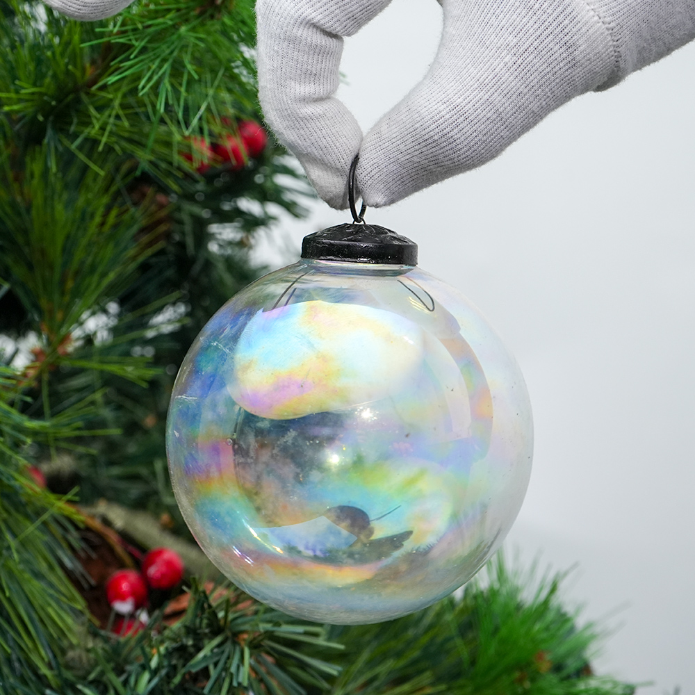 Transparent Round Glass Hanging Ornament. Crafted from high-quality glass with a smooth glossy finish, this decorative bauble adds a classic and festive touch to Christmas trees, wreaths, and holiday displays.