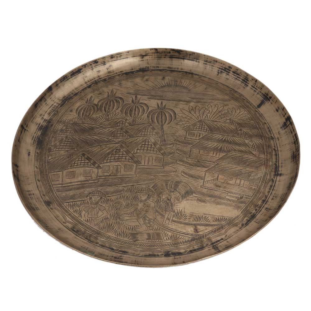 Engraved Bell metal trayPlate village Farming Scene coconut Trees And Paddy cultivation . Serveware,Tableware, dinnerware, wall decoration for home, office, restaurant, clubs . Anniversary gift, new year gift. Gifting option for your friends and family.