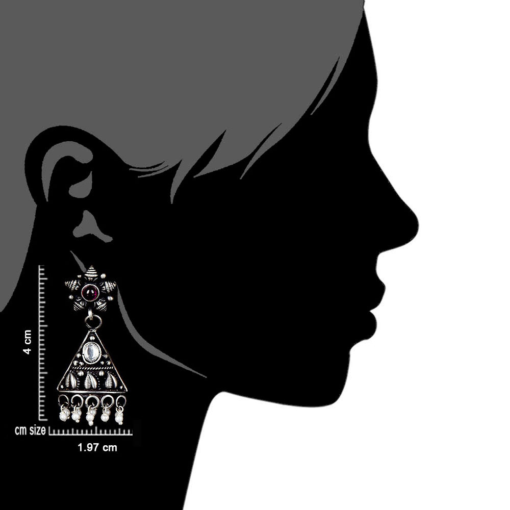 Hand crafted Triangle 92.5 Sterling Silver Dangler earrings with embossed round circles ,small balls and leaves with silver hangings on the bottom. It has a lovely floral stud made of silver with amethyst centre . Gift it yourself or any near or dear ones.