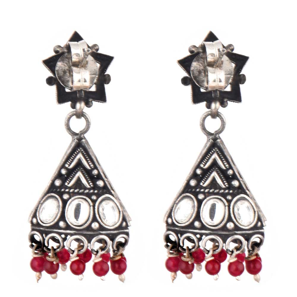 Handmade 92.5 Sterling Silver jhumkis with starry delight amethyst Stud And Triangular Jhumkis with garnet and pearl tassels that will add more character to your expensive sari, Lehehgas, suits and other formal attire . Gift it to your near and dear ones and that someone special on weddings, birthdays and valetine day.