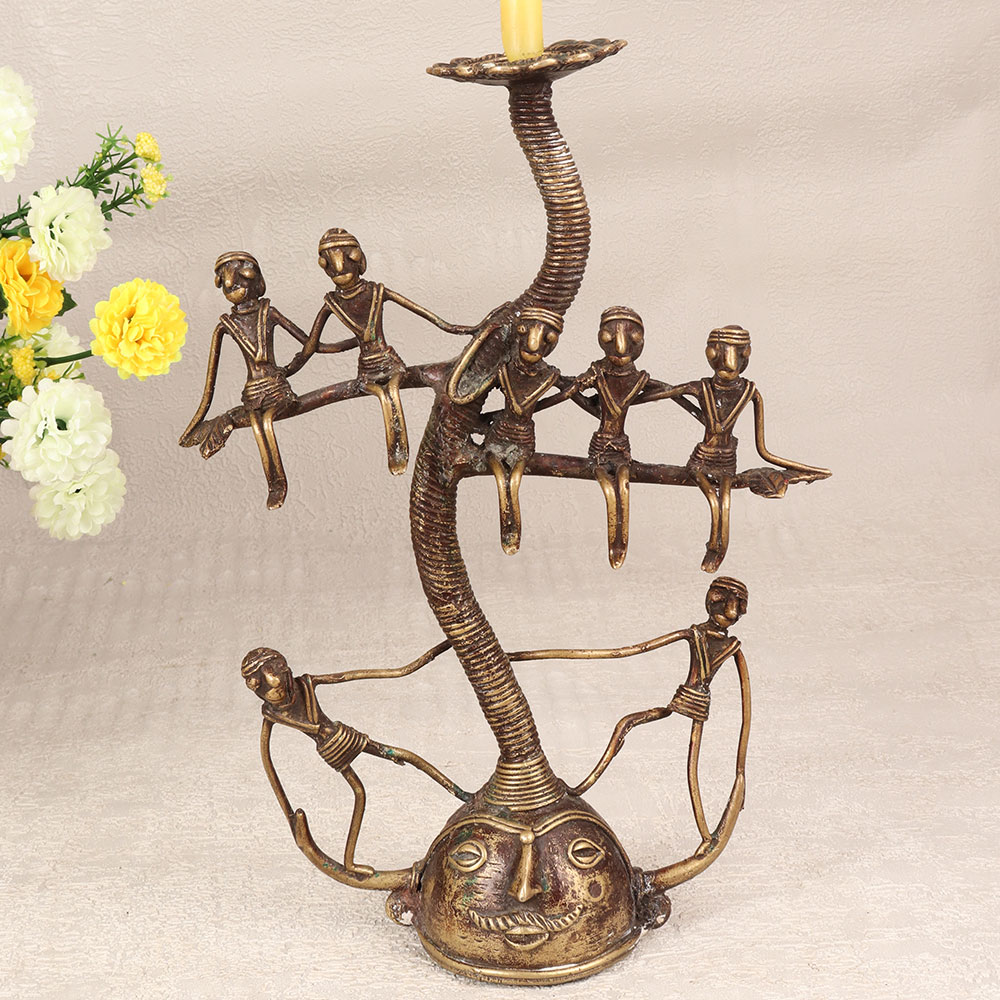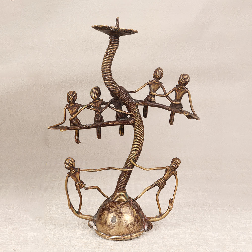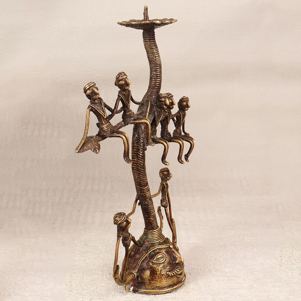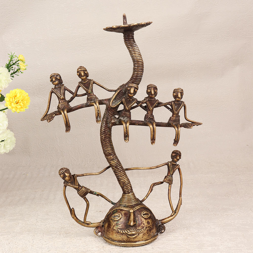 Decorate your home with our enchanting Vintage Brass Candle Stand that is a testament to the craftsmanship of professional artisans in Tribal Art. Handmade from premium brass, this tree-shaped stand boasts a rich antique brown finish, adding a touch of timeless elegance to any space. The intricately designed branches hold seven figures in serene poses, creating a captivating tableau reminiscent of cultural heritage. Perfect for special or auspicious occasions, this candle stand invites warmth and charm, making it an ideal centerpiece during family gatherings, intimate dinners, or celebrations with friends. Its versatile design suits various settings, enhancing the ambiance in homes, offices, restaurants, hotels, or cafes. Embrace the nostalgia of yesteryears by adding this piece to your vintage collection, or gift it to your family, friends or relatives on special, festive, or auspicious occasions.