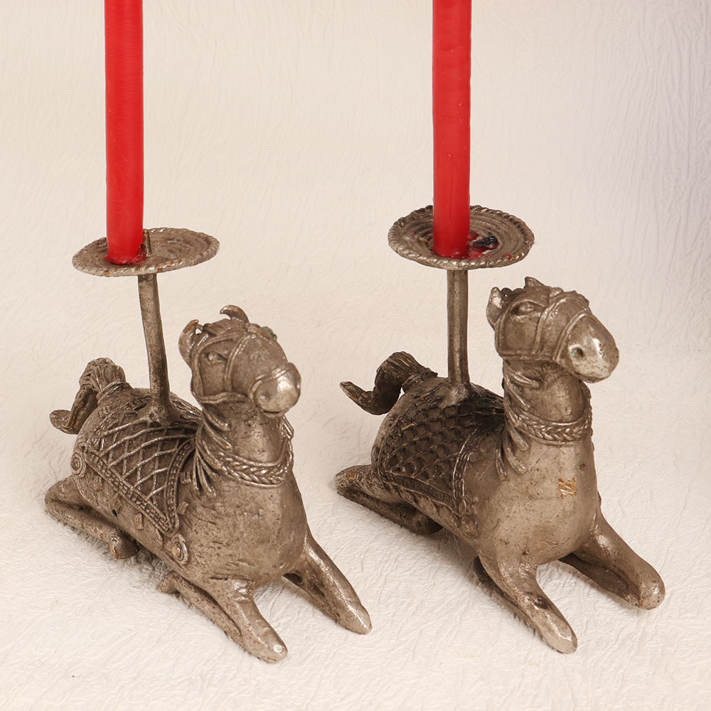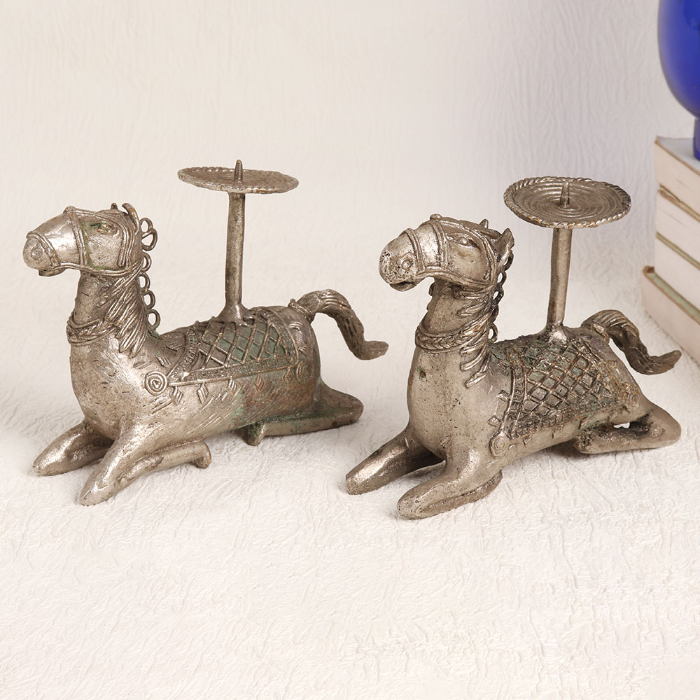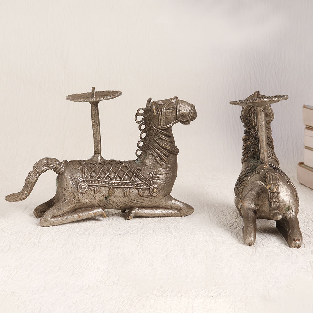 These Brass Horse Candle Holders are silver-plated to perfection and has an antique silver hue. Crafted by skilled artisans in the Tribal Art tradition, these candle holders are a testament to fine craftsmanship and attention to detail. Made from finest quality brass, they exude a timeless charm that seamlessly blends with any setting. Whether you place them at home, in your office, a restaurant, hotel, cafe, or shop, these candle holders instantly enhance the ambiance. These pieces are not just décor, they are a piece of history that you can add to your vintage collection or proudly display at exhibitions. Their intricate design and rustic silver finish make them a conversation starter at any gathering. Looking for the perfect gift? These Brass Horse Candle Holders are an ideal choice for your family, friends or relatives on special, festive, or auspicious occasions. Whether it's a housewarming, wedding, or any celebration, these candle holders will leave a lasting impression with their elegance and craftsmanship.
