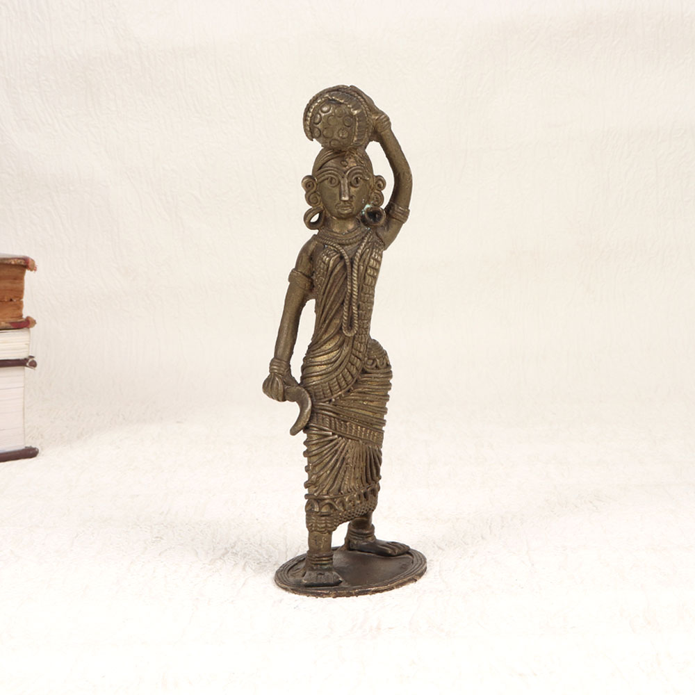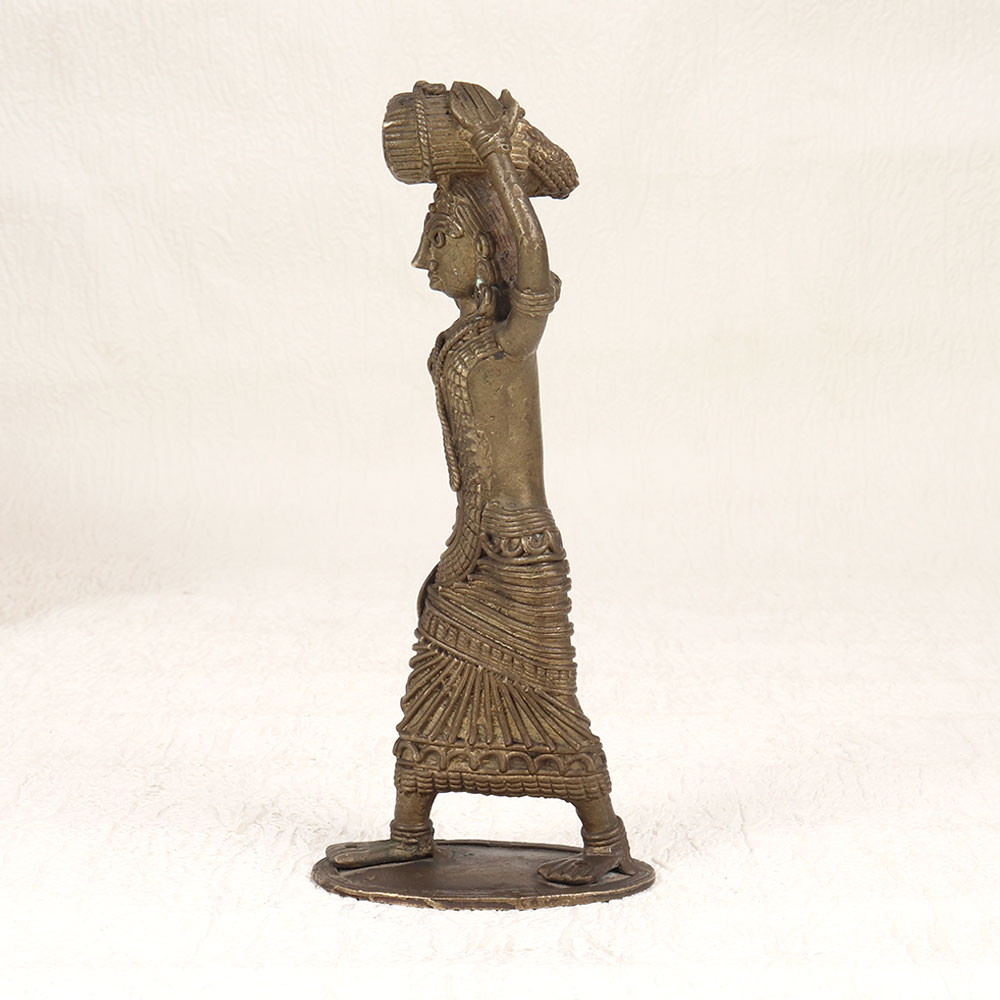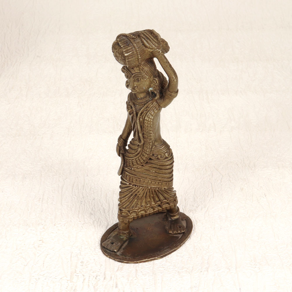 Enhance the rich cultural heritage of Bengal with this vintage brass tribal art lady statue that is meticulously crafted by highly skilled and experienced Indian artisans. Standing gracefully, the statue depicts a tribal woman carrying a bountiful crop on her head, symbolizing the harmonious connection between nature and human life. In her hand, she holds a finely detailed crop cutting knife, capturing the essence of agricultural traditions. The statue boasts an antique brown finish, adding an aura of timeless elegance to any space. Handmade with precision and care, this piece is a testament to the mastery of Bengali Art and showcases the cultural vibrancy of the region. Crafted from high-quality brass, it exudes durability and authenticity. Ideal for home, office, restaurant, hotel, or cafe decor, this statue seamlessly blends tradition with sophistication. It serves as a captivating addition to any vintage collection and doubles as a thoughtful gift for your family, friends or relatives during special, festive, or auspicious occasions.