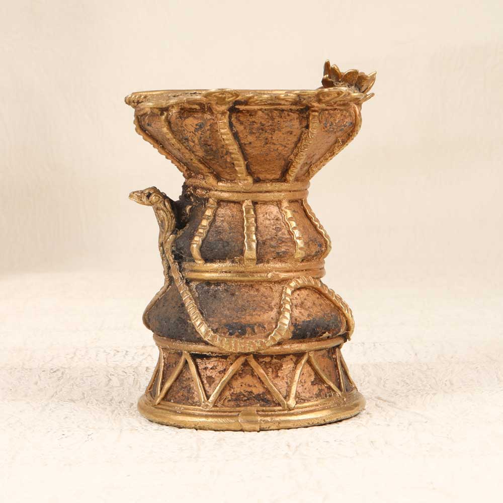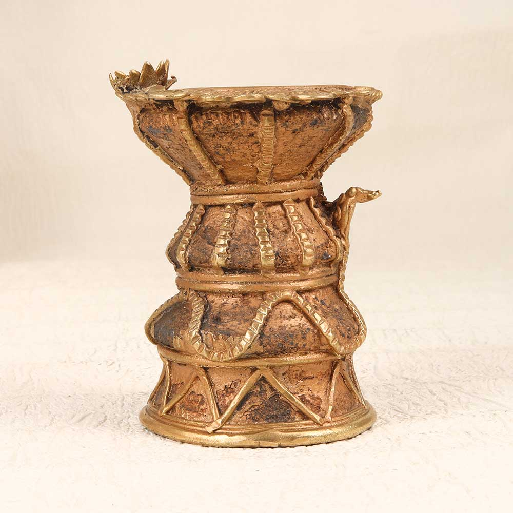 With an ornate tribal cobra engraving, this vintage brass oil lamp brings exotic flair to your home decor. The hand-engraved motif and brown finish give this lamp an antiqued, old-world look and feel. Indulge in the warm, welcoming glow of antique lamplight. The soft ambience and flickering flame create a relaxed, cozy atmosphere. Place this lamp in your living room, bedroom or patio to infuse your space with exotic elegance and vintage charm. For those looking to add an eye-catching accent to their home, this tribal-engraved brass lamp is a stunning decorative piece. The ornate cobra motif and old-fashioned lighting transform your decor into a charming, exotic retreat. Light up your home with antique-inspired style.